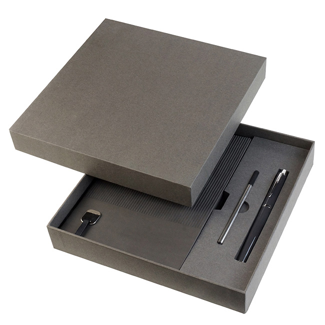 Set Kampala Set Kampala Incluye libreta, bolígrafo y estuche de presentación. l Libreta con 90 hojas rayadas tipo planeador atemporal. l Cinta divisoria con remate de placa metálica. l Funcionales cubiertas flexibles con diseño en líneas. l Colores: Gris y Negro