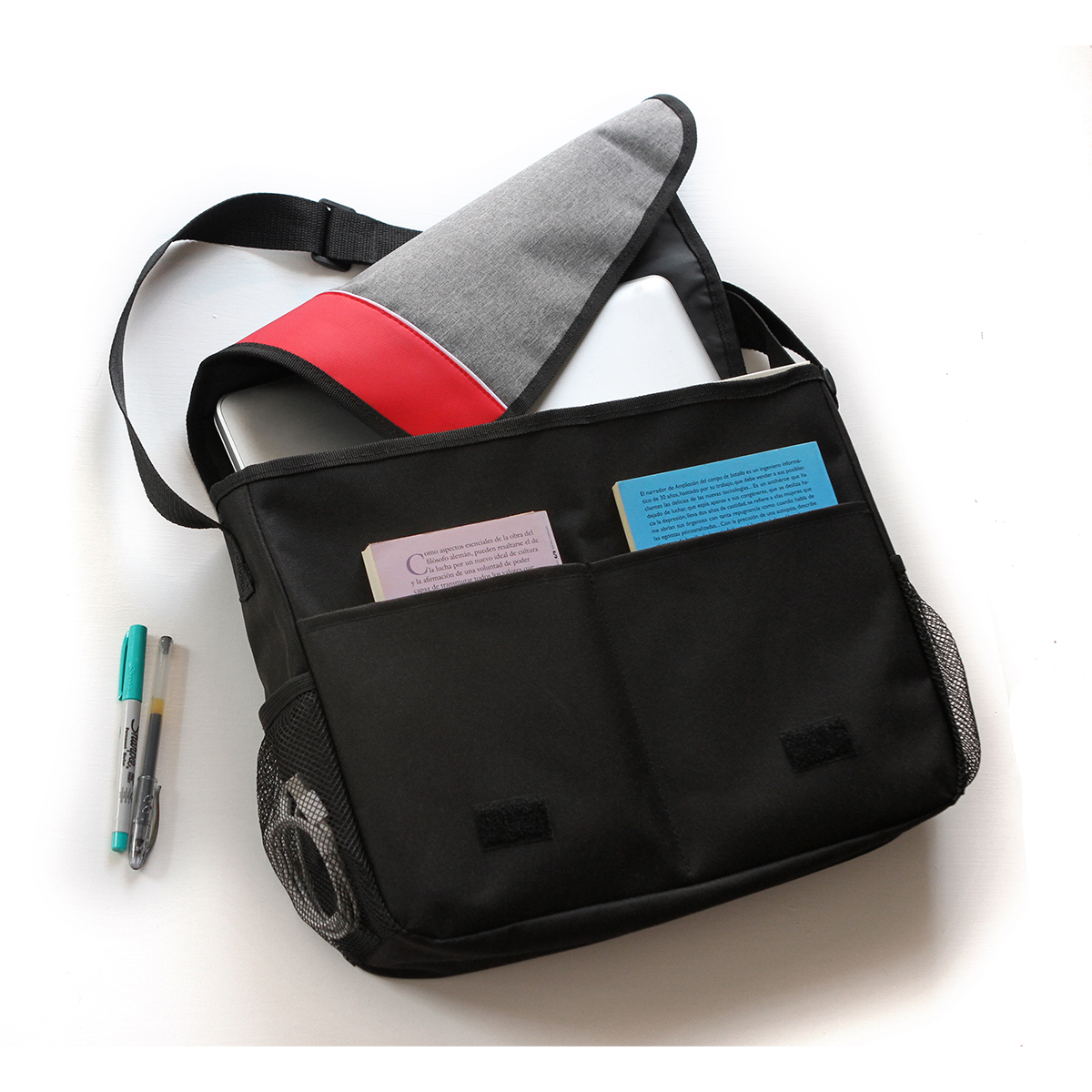Maletín Arbuzzo. - Maletín fabricado en poliéster con compartimento para laptop, bolsillo frontal con cierre, cuenta con 2 compartimientos, correa de hombro ajustable, asa en la parte superior y 2 bolsillos en los laterales de la bolsa.