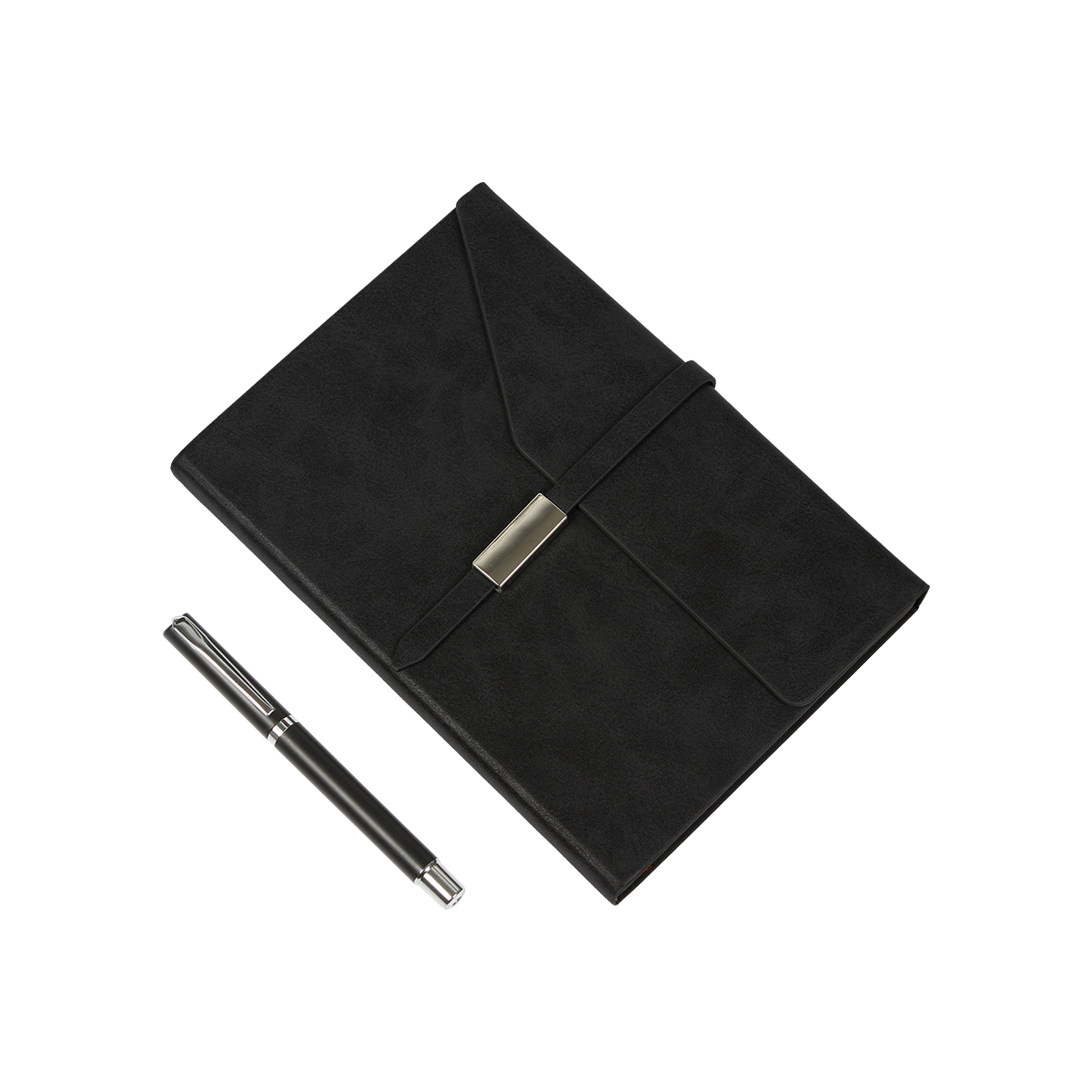 Set de libreta Cattel. - Set de libreta de poliuretano (PU) con libreta de 100 hojas rayadas y  bolígrafo de plástico con clip metálico a juego. La libreta cuenta con un detalle de metal para cerrarla de manera fácil. Esta elegante carpeta está confeccionada en curpiel de alta calidad, lo que le proporciona un aspecto lujoso y sofisticado, además de una durabilidad excepcional, además viene acompañada de una elegante caja de regalo, lo que la convierte en una excelente opción para obsequiar.