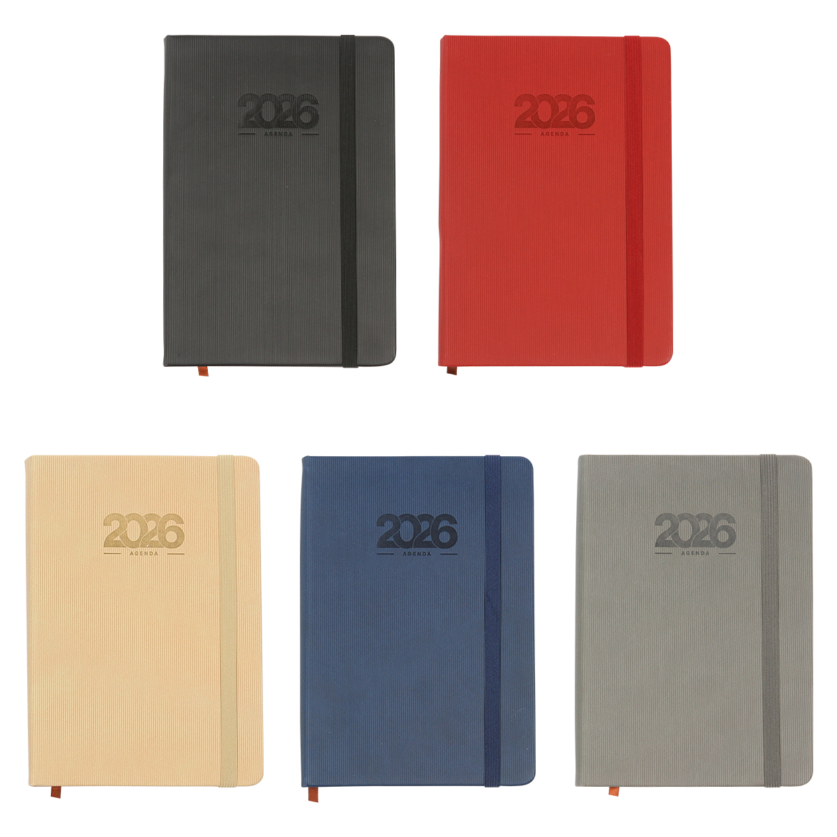 Agenda Diaria Giordano. - Set de Agenda diaria 2026 con pluma y caja de regalo. Cubierta fabricada en curpiel (PU) con resorte sujetador e interior de 175 hojas de 65 g. (350 paginas) Cada día tiene espacio para tareas importantes y está organizada por horario (5:00 am - 22:00 pm). Cuenta con: Separador de hojas, Calendario anual 2025-2027, planeador mensual, hoja de objetivos anuales, hoja de pendientes mensuales, espacio para notas, tareas, sección de contactos y bolsillo interno para almacenar documentos. Incluye caja de cartón individual y bolígrafo con tinta de escritura negra.