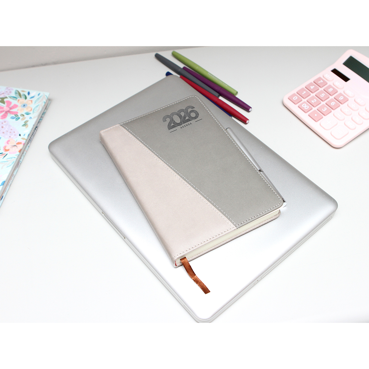 Agenda Diaria Cameri. - Set de Agenda diaria 2026 bi-tono con pluma y caja de regalo. Cubierta bi-tono fabricada en curpiel (PU) e interior de 175 hojas de 65 g. (350 paginas) Cada día tiene espacio para tareas importantes y está organizada por horario (5:00 am 22:00 pm). Cuenta con: Separador de hojas, calendario anual 2025-2027, planeador mensual, hoja de objetivos anuales, hoja de pendientes mensuales, espacio para notas, tareas, sección de contactos y bolsillo interno para almacenar documentos. Bolígrafo con detalle de bambú en la parte inferior, clip y punta metálicos y con touch en la parte superior. Incluye caja de cartón individual y bolígrafo con tinta de escritura negra.