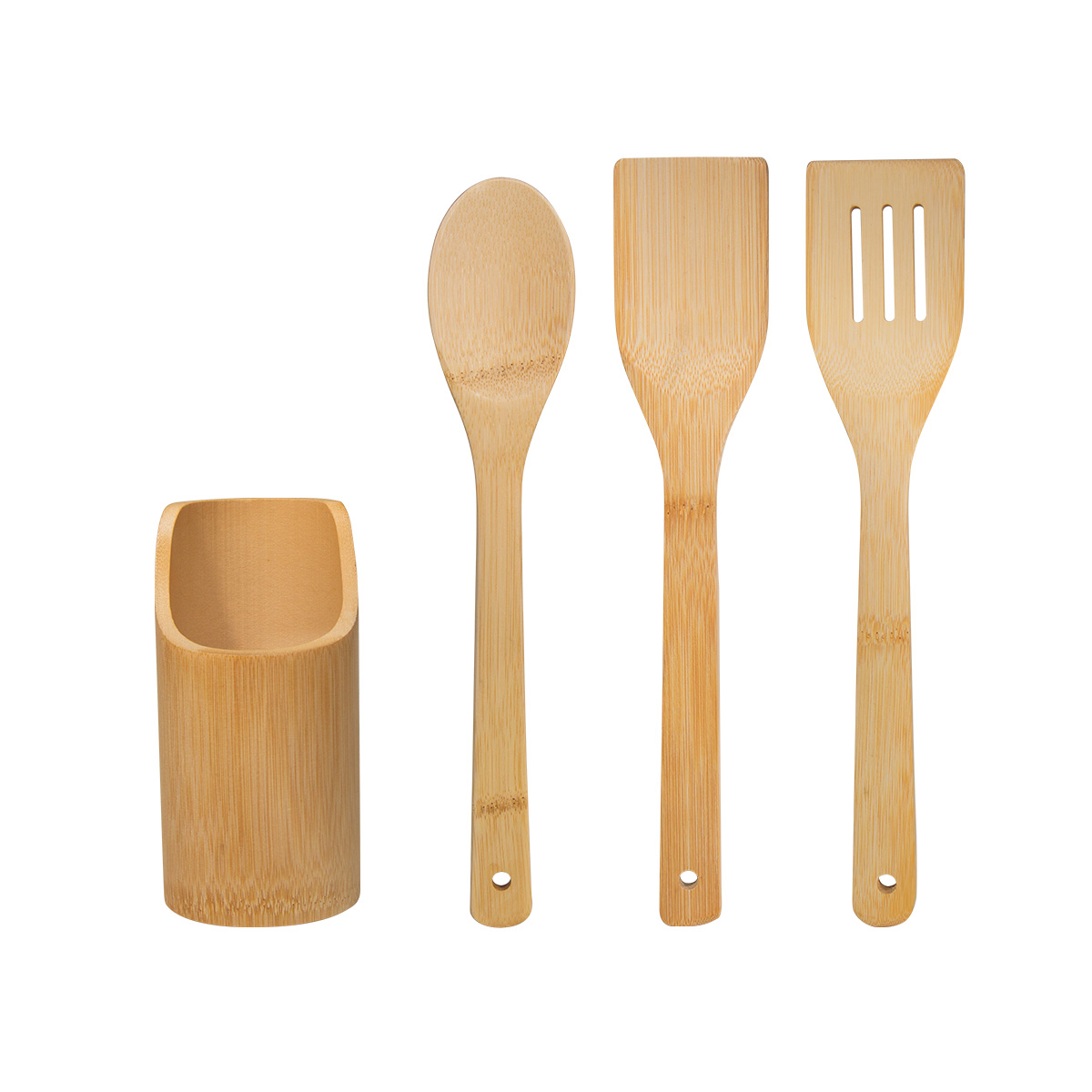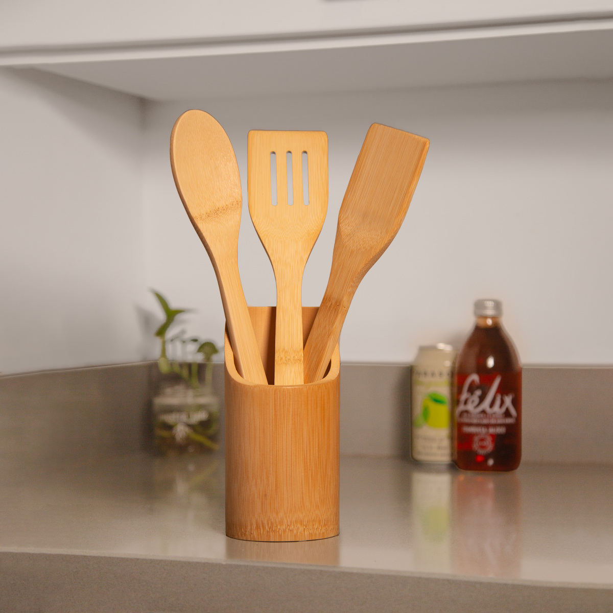 SET DE UTENSILIOS AVIVA - Juego de 3 utensilios de bambú para cocinar. Incluye cuchara, pala, volteador y una base cilíndrica. El bambú es un producto natural el cual puede presentar variaciones en tonalidades, veta y diámetro de la base por el grosor del tallo.