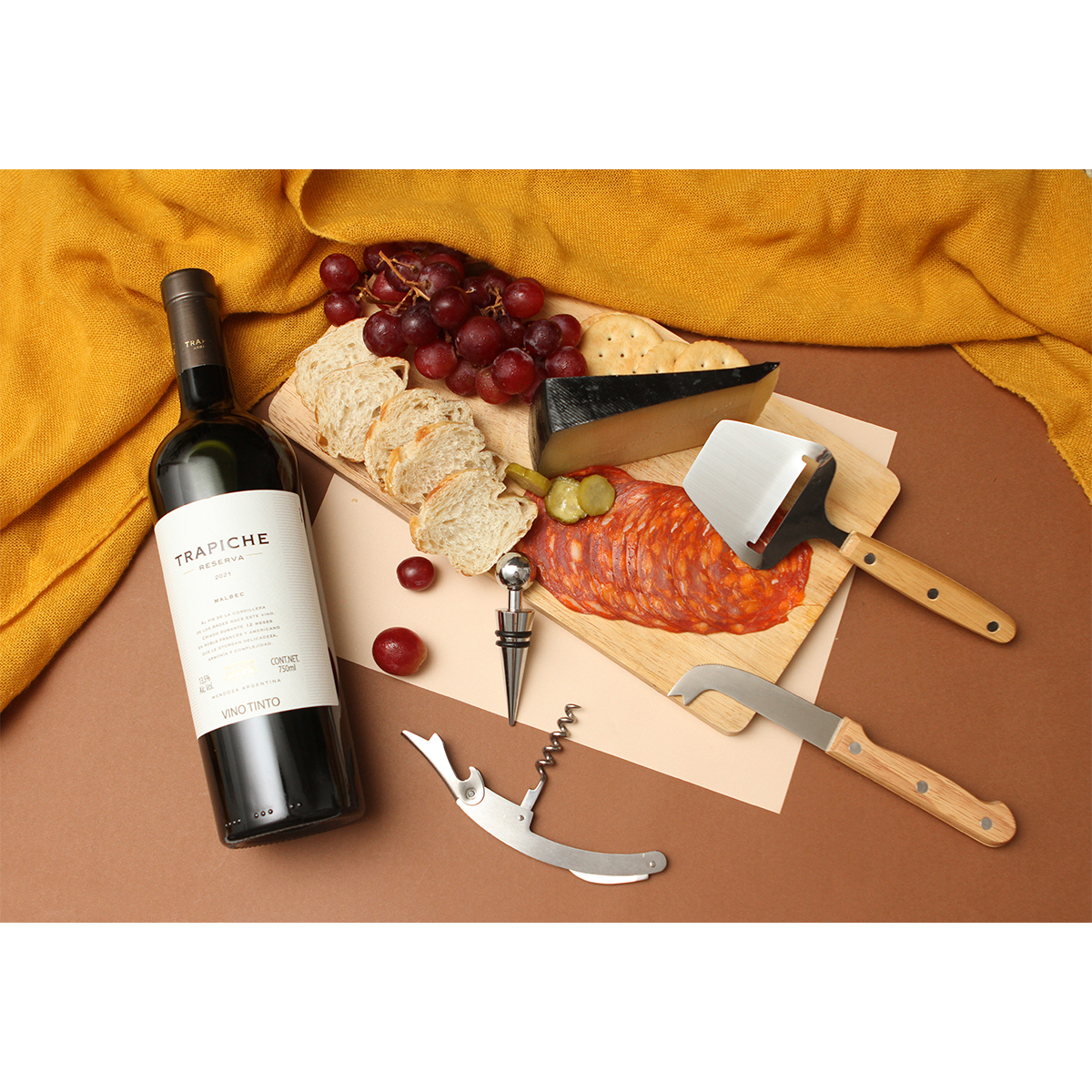 Set para quesos Rovereto. - Set de quesos y vinos presentado en un estuche de pasta rígida. Incluye un rebanador de quesos, cuchillo, tapón de vino y sacacorchos con navaja y destapador