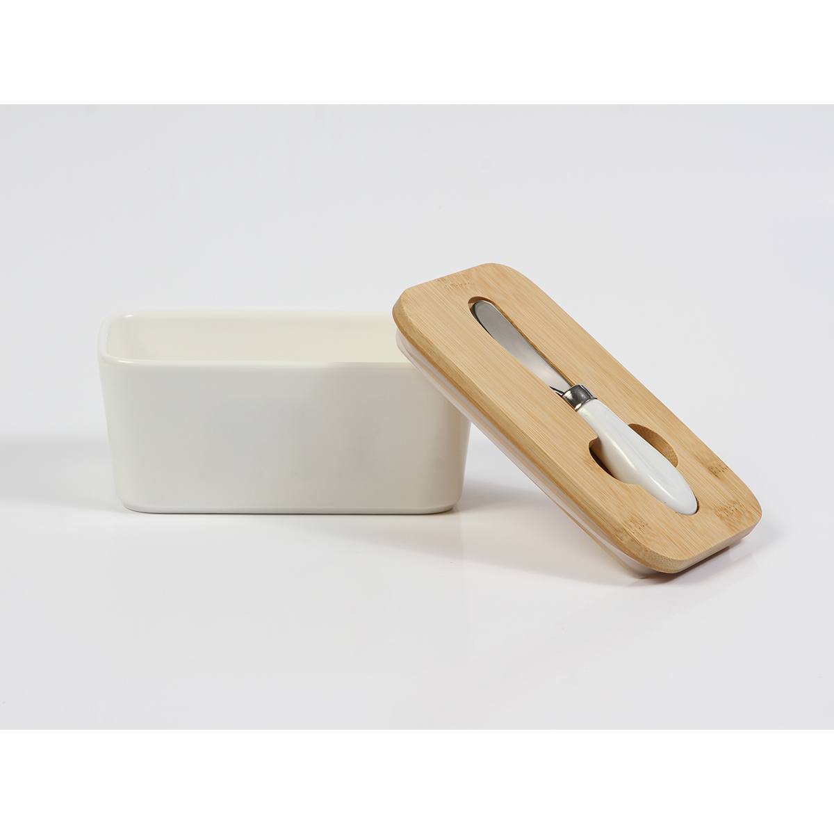 Recipiente Tengah. - Recipiente para barras de mantequilla fabricado en cerámica y tapa de madera con función hermética y espacio para almacenar el cuchillo. Incluye cuchillo untador. La combinación de la cerámica y madera vuelven este recipiente una opción súper elegante para tu cocina.