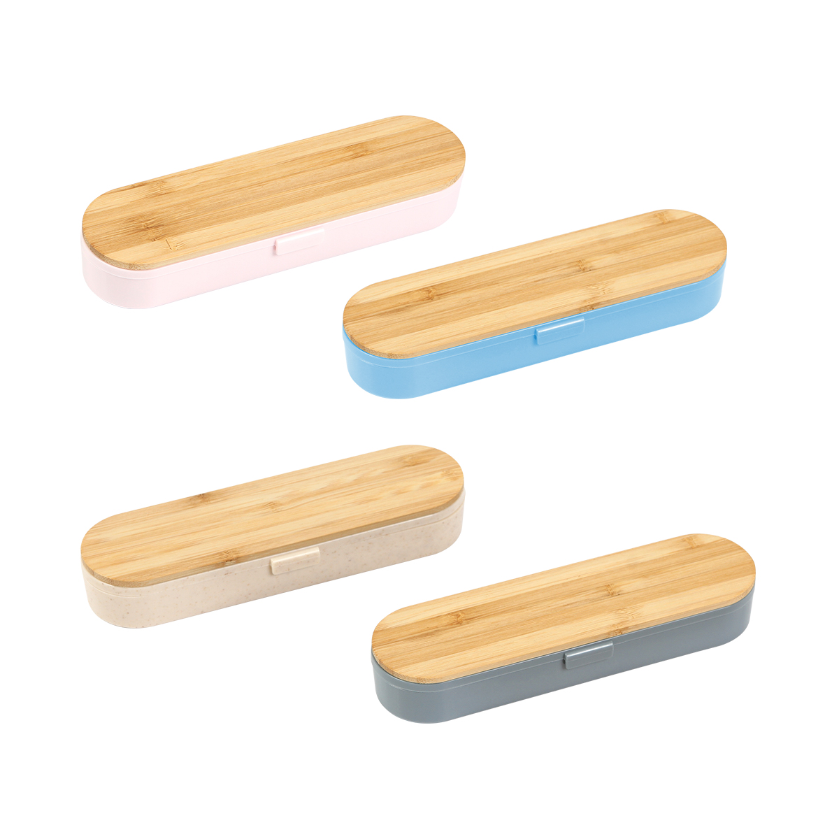 Set Ascoli. - Set de cubiertos con estuche fabricado en plástico, con tapa de bambú. Incluye cuchara, tenedor y cuchillo fabricados en bambú.