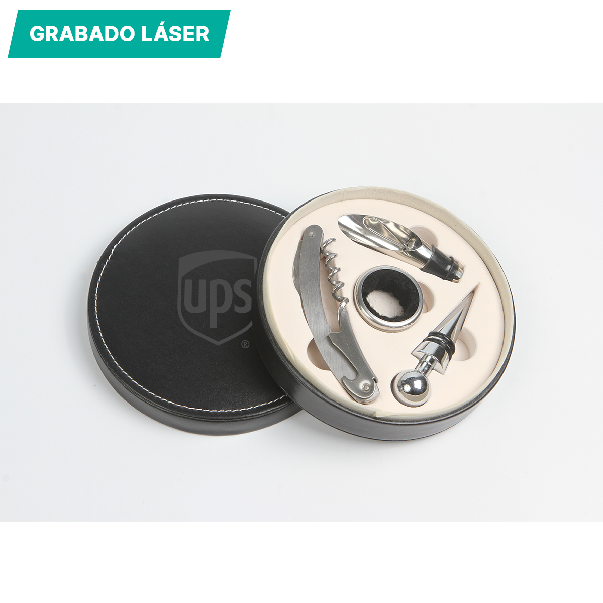 Set de vinos Multán. - Set de vino redondo con accesorios metálicos, el compañero perfecto para los amantes del vino. Este set completo y elegante incluye todos los elementos esenciales para disfrutar y servir el vino de manera sofisticada. Cuenta con sacacorchos, boquilla, corcho metálico y cortagotas, este set te brinda todas las herramientas necesarias para una experiencia de vino excepcional.