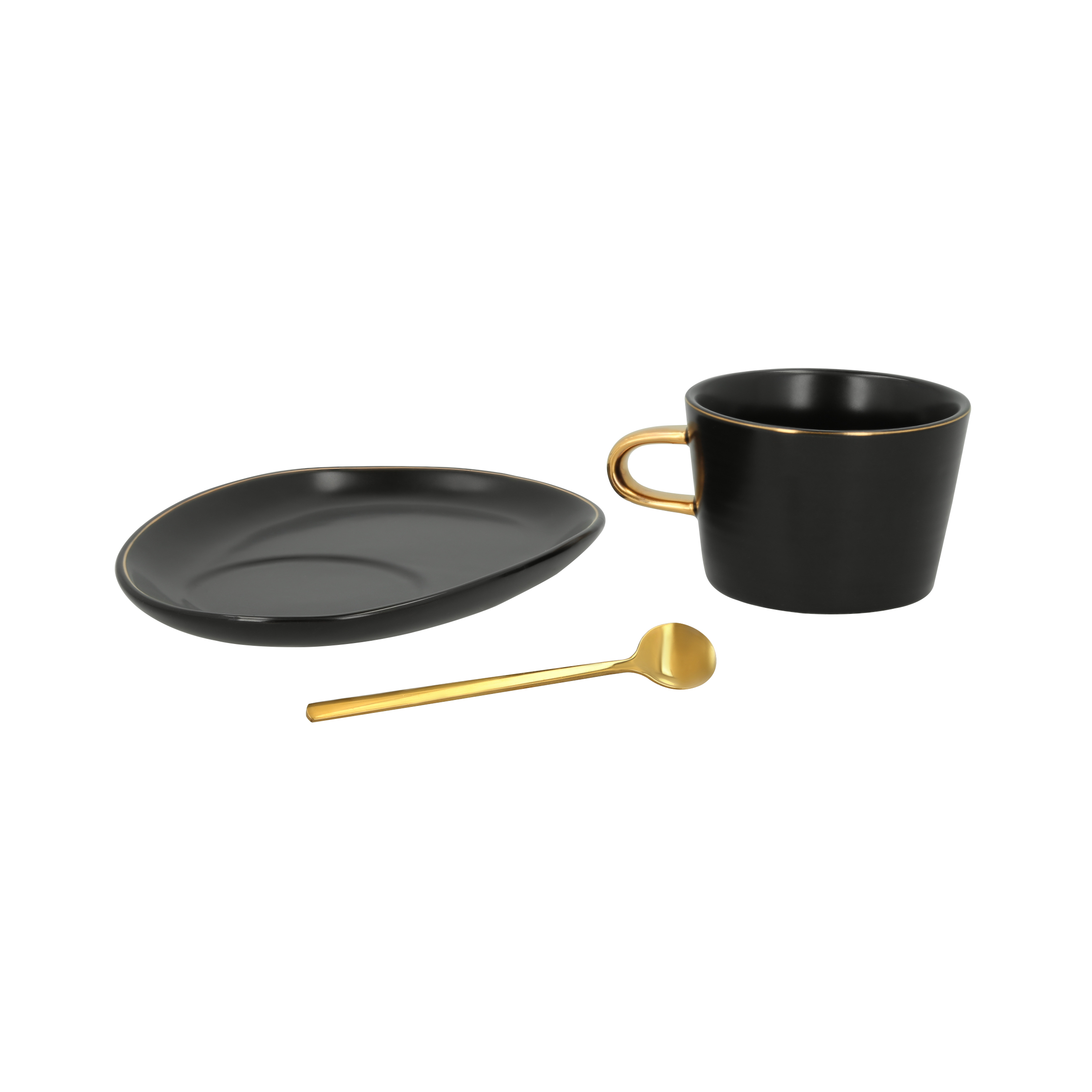 CHIP Taza de cerámica con cuchara de acero inoxidable y plato de cerámica.