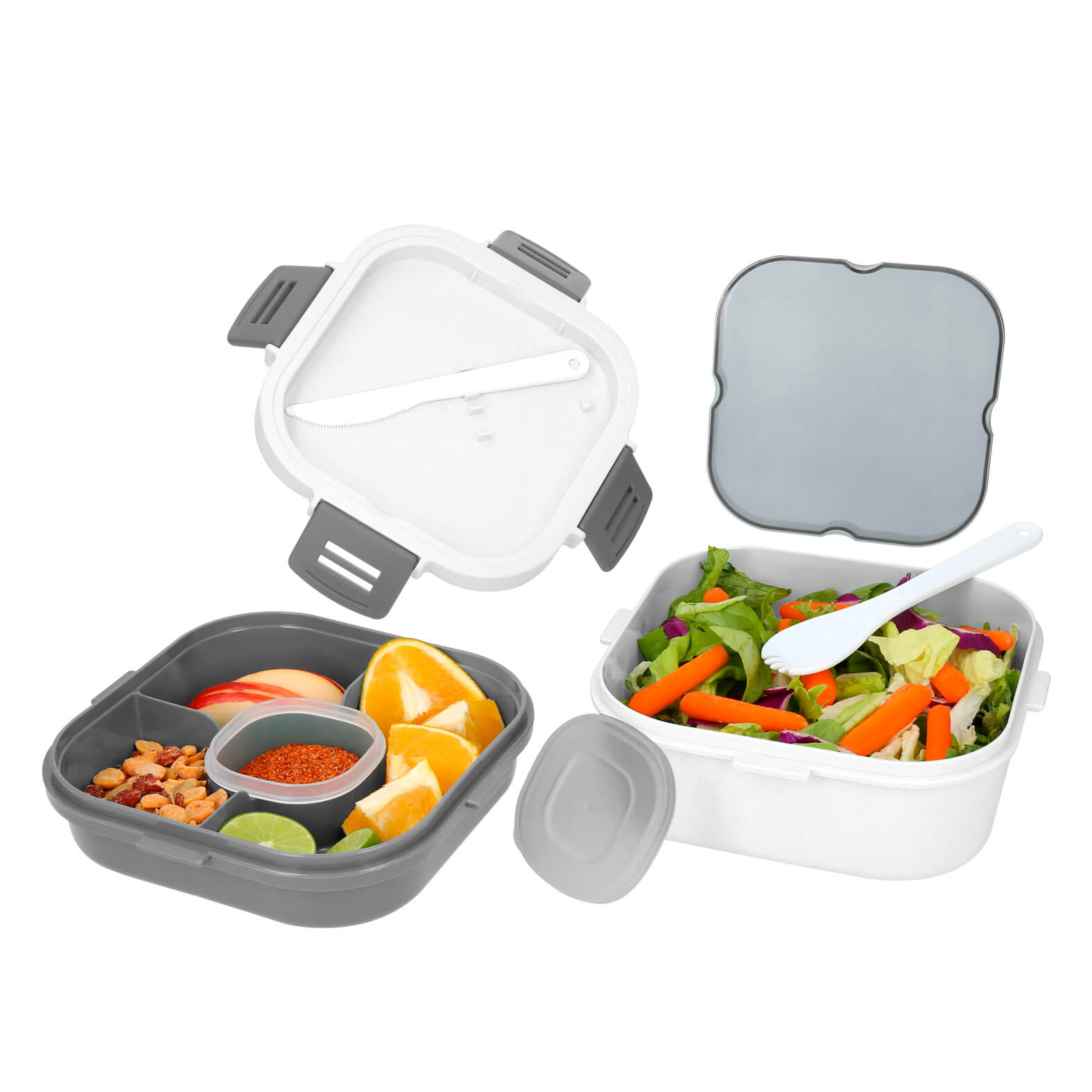 CURRY Contenedor de alimentos de plástico con 2 niveles, 1 parte superior con 3 compartimentos y 1 mini recipiente, 1 parte inferior onda, cierre hermetico con 4 broches de seguridad y compartimento para cubiertos.