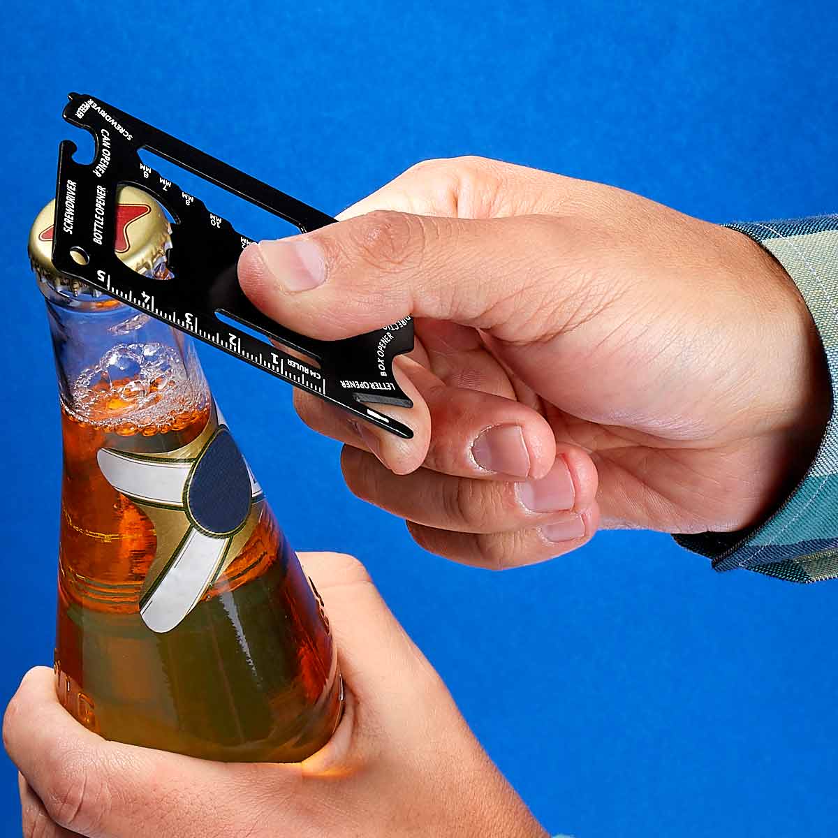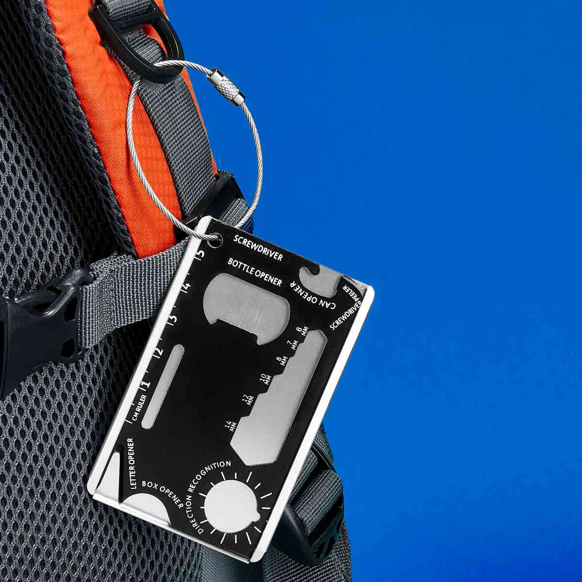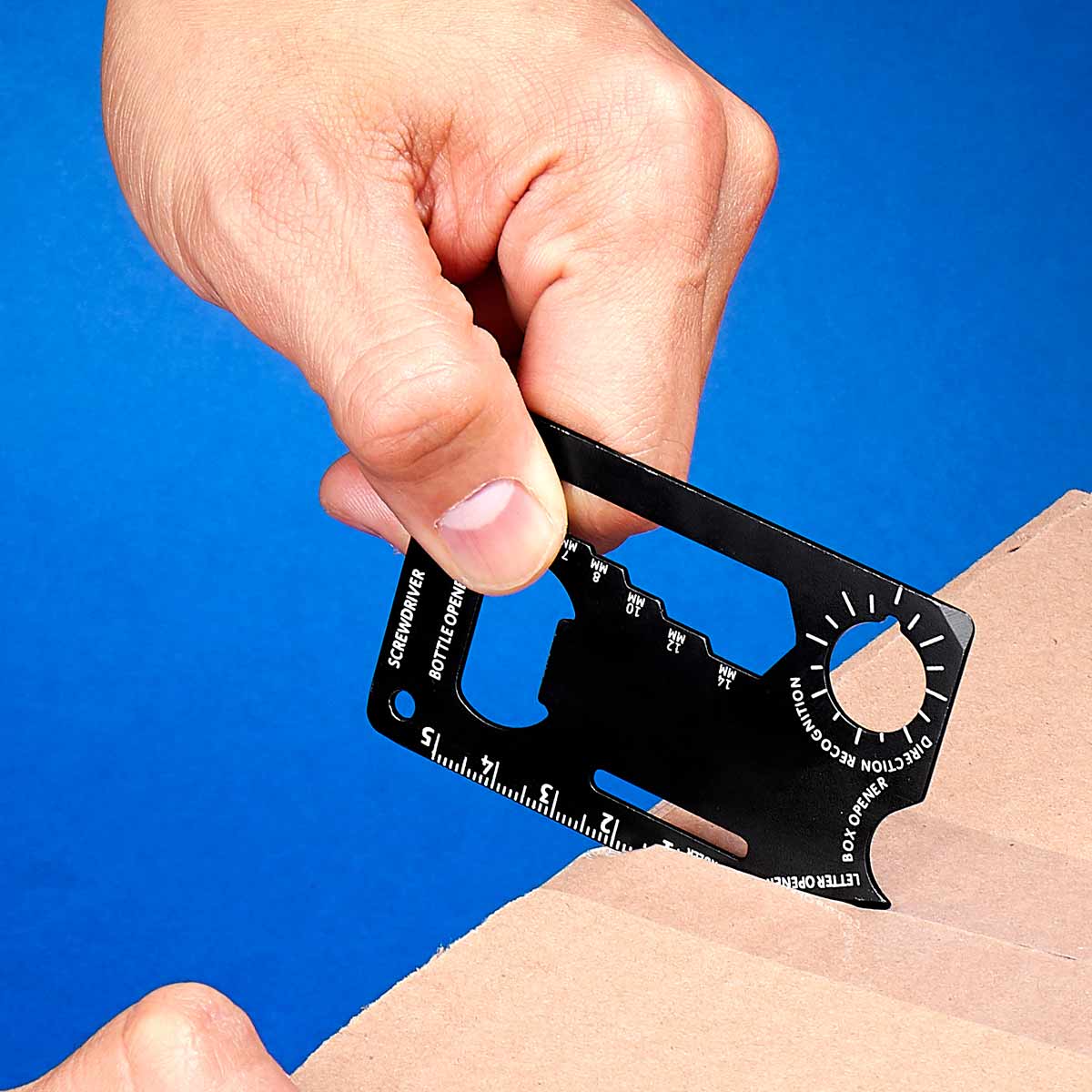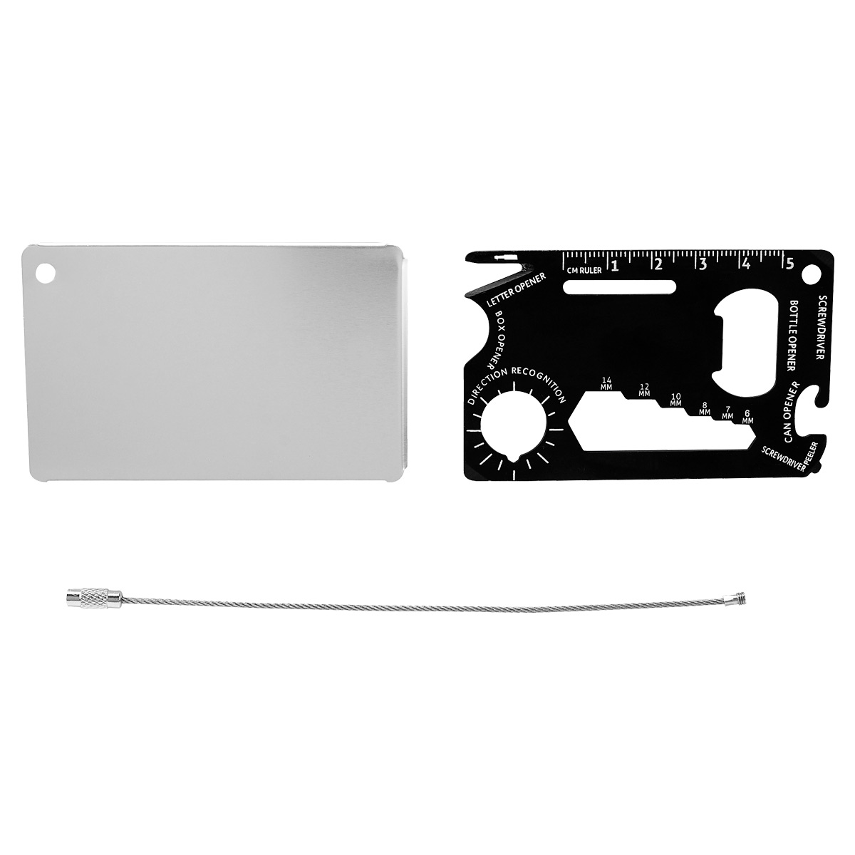 TARJETA MULTIHERRAMIENTAS COMALA - Tarjeta multiherramientas con función de desarmador, abrecartas, abrelatas, destapador, llave inglesa, regla y pelador. Incluye aro para llavero.