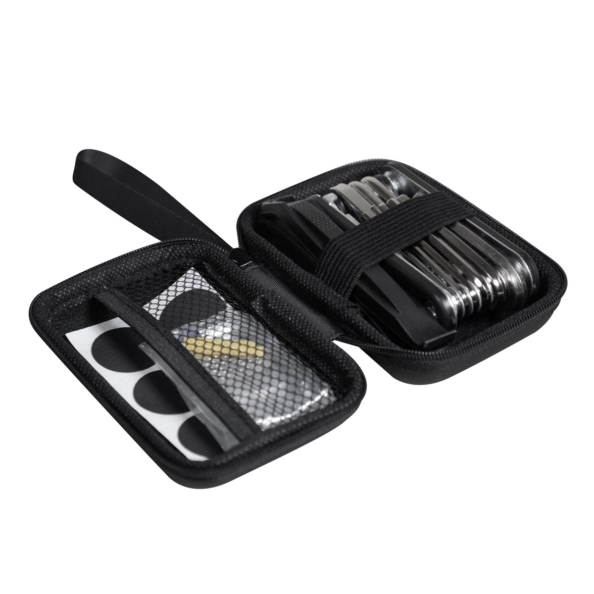 SET DE HERRAMIENTAS LEVER - Kit de herramientas para bicicleta. Incluye 6 parches redondos y 2 palancas de plástico para neumático, 2 tubos de goma para fijar válvulas, 1 herramienta de lijado, 1 herramienta multifunción 16 en 1 con llaves allen y destornilladores. Estuche compacto de EVA con elástico que lo hace fácil de transportar y se ajusta de manera conveniente a la bicicleta o al equipo de ciclismo.