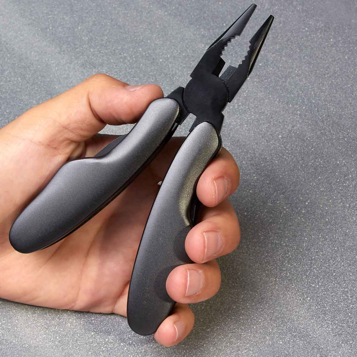 PINZAS YAVIA - Pinzas con 9 funciones. Incluye lima para uñas, navaja, desarmador de cruz, destapador con desarmador plano, pinzas, navaja de hoja curva, desarmador plano, serrucho, navaja dentada. Incluye funda.