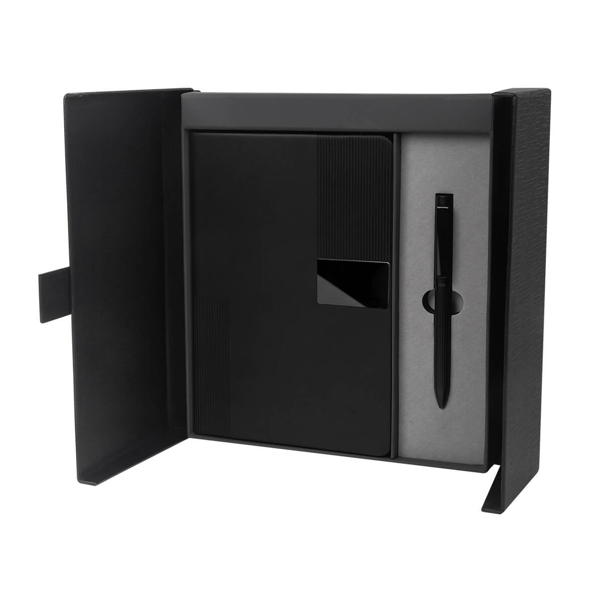 SET DE LIBRETA DICKENS - Elegante Set con caja de regalo. Incluye libreta con 100 hojas a rayas, cubierta rígida de curpiel y listón separador. Su placa metálica le aporta un toque distinguido y de buen gusto, que además se complementa con su diseño y líneas de grabado. Incluye un bolígrafo de metal en terminado mate con sistema twist y además, cuenta con caja de regalo con nuevo sistema de cierre imantado.
