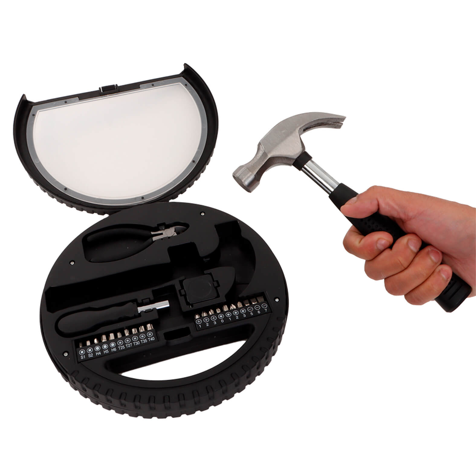 TIFF Set de herramientas en forma de llanta que incluye: 1 martillo, 1 pinza, 1 flexómetro, 1 destornillador y 2 juegos de 10 puntas.