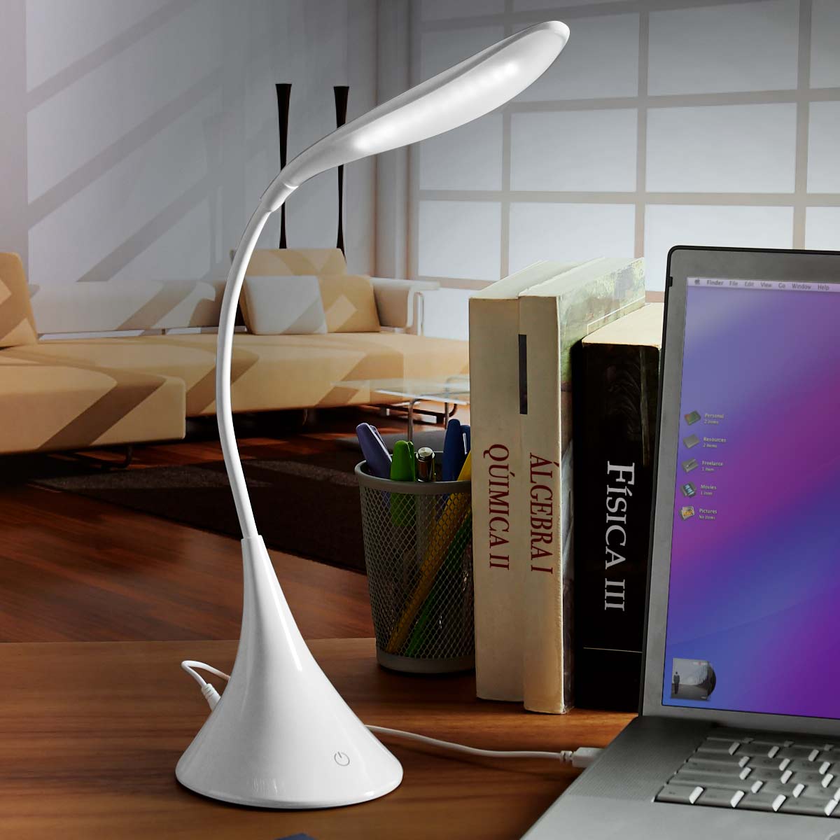 LÁMPARA SWAN - 12 LEDS. Cuello flexible y ajustable. Funciona con baterías y con cable USB. Intensidad de luz ajustable. No incluye baterías (3 pilas AA).