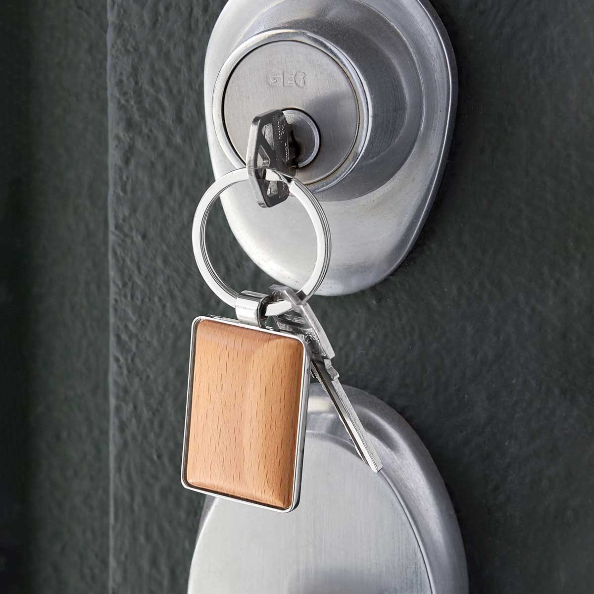 RUMAH Llavero metálico con frente de madera en forma de casa y arillo reforzado...