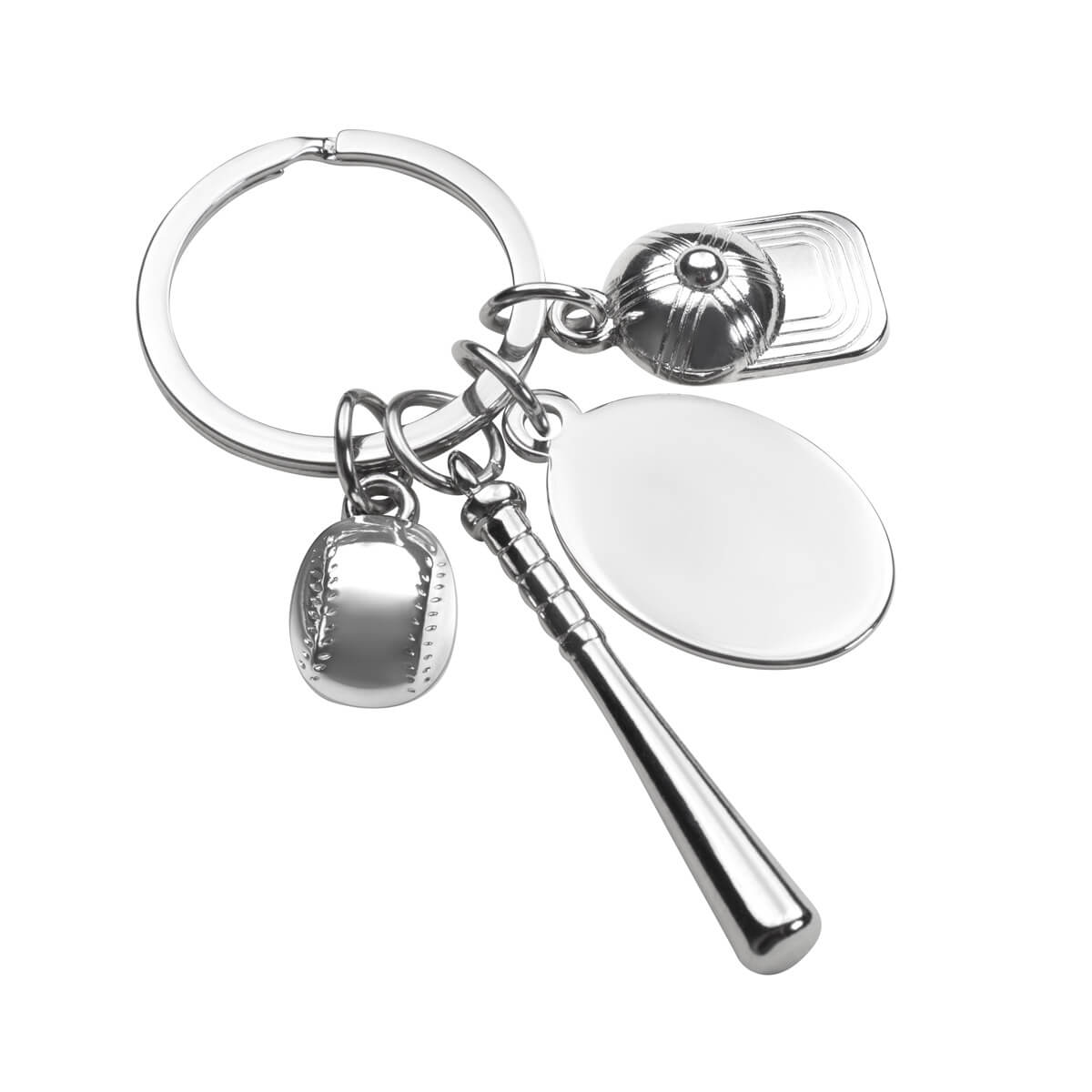 LLAVERO BUNT - Llavero metálico con placa para grabado. Incluye 3 dijes con diseño de: bate, pelota y gorra. Este llavero es ideal para los apasionados del béisbol. Incluye caja individual.