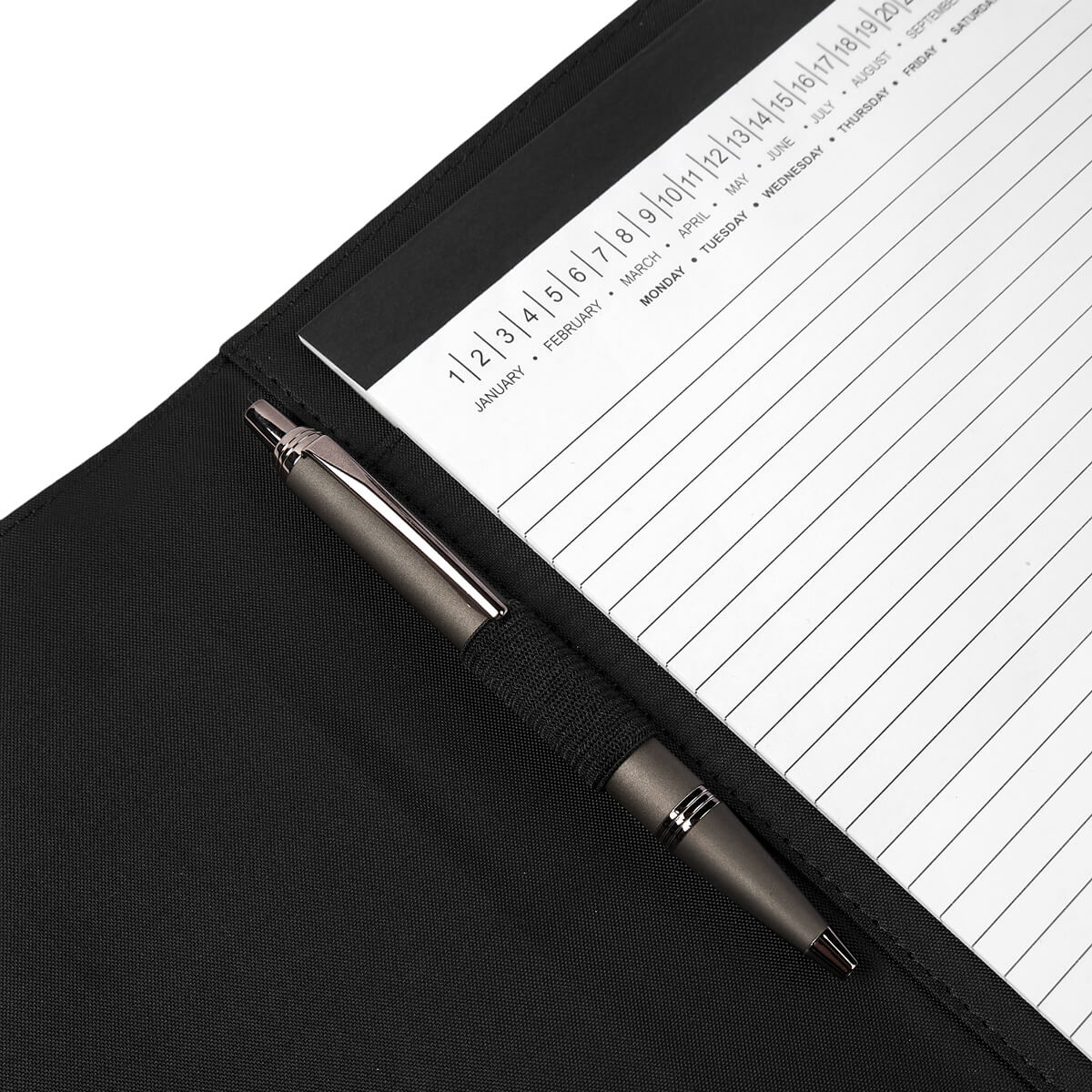 CARPETA SEKI - Carpeta con block de notas. Incluye 40 hojas con línea a raya para facilitar la escritura ordenada. En su interior cuenta con compartimentos para organizar documentos y un elástico interno para bolígrafo. Incluye cintillo con cierre imantado.
