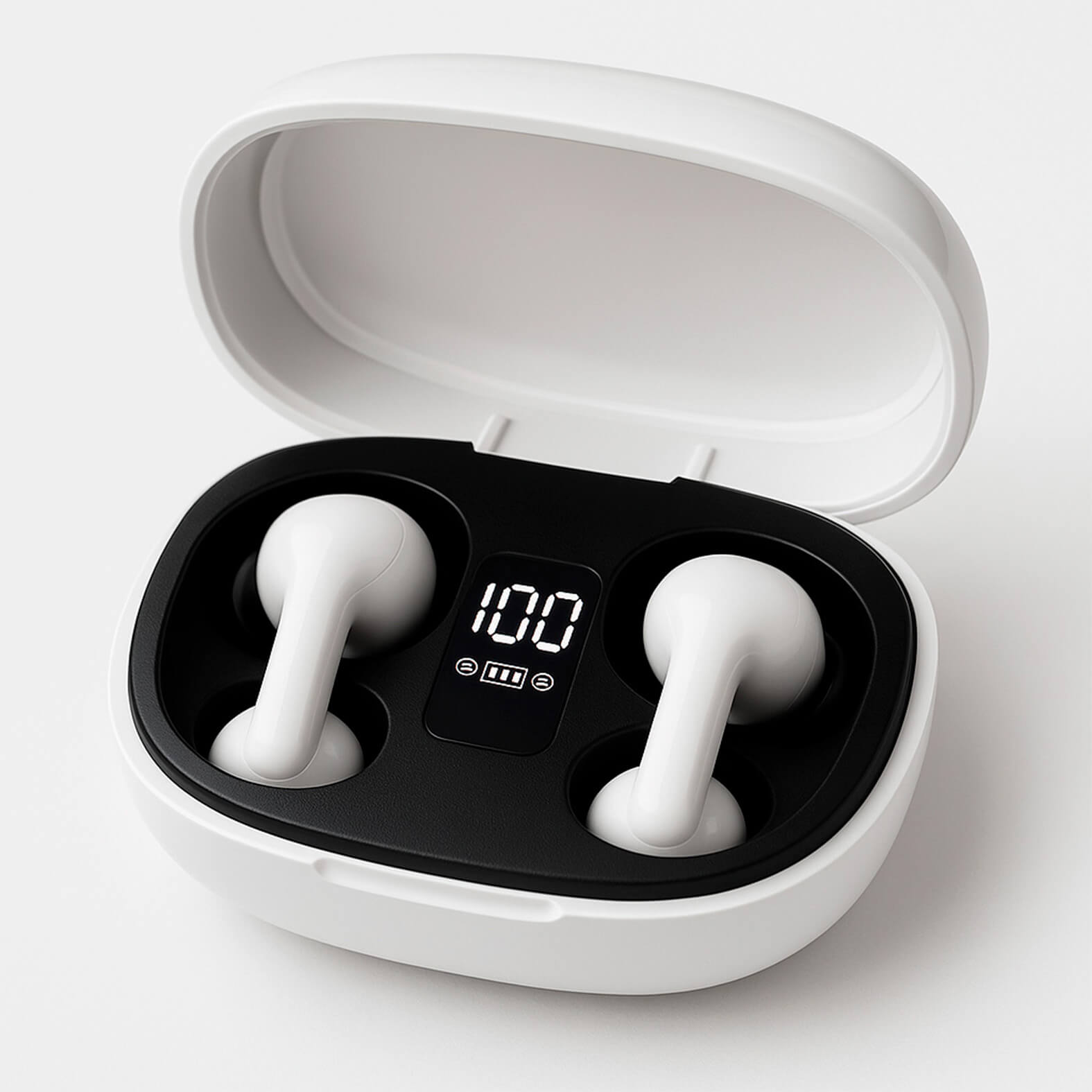 LANE Audífonos inalámbricos con botones táctiles para pausar/reproducir, adelantar y retroceder. Incluye un estuche recargable con indicador de carga y entrada tipo C.