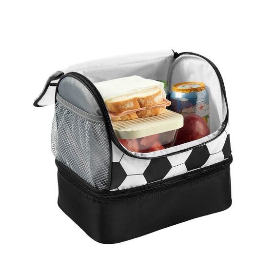 LONCHERA SOCCER - Lonchera con interior plastificado. Doble compartimento con cierre. Bolsa lateral de red y asa de agarre superior. Capacidad para 9 latas.