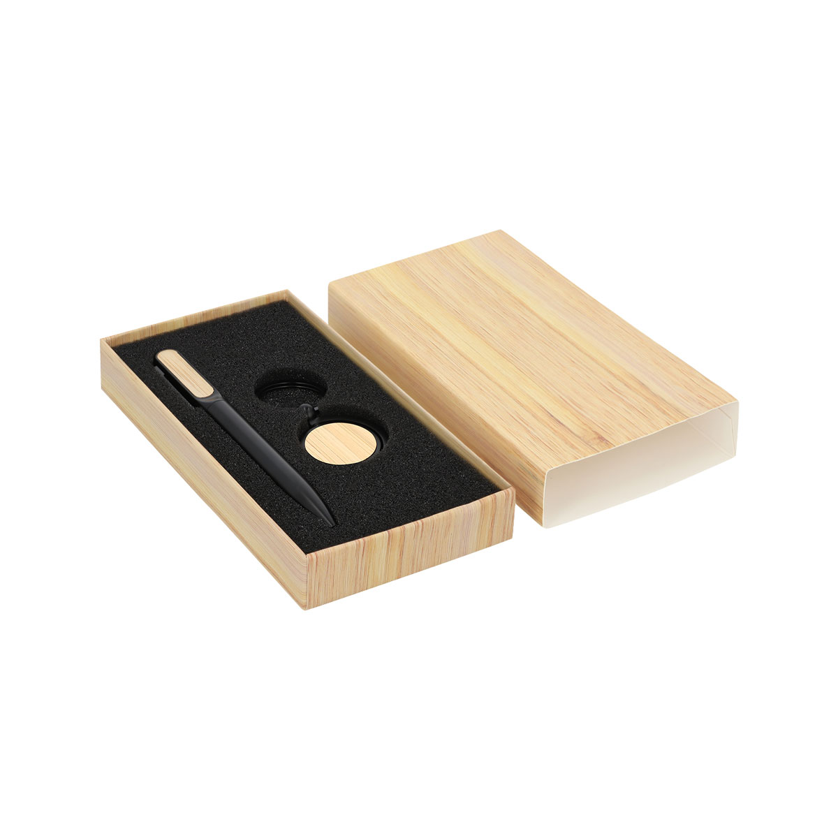 MATERIAL: Metal / Bambú MEDIDAS: 1 x 14 cm Bolígrafo / 3.5 x 7.5 cm Llavero IMPRESION: Láser / Serigrafía MED. EMPAQUE: 72 x 30 x 39 cm PESO EMPAQUE: 11 Kg PIEZAS EMPAQUE: 100