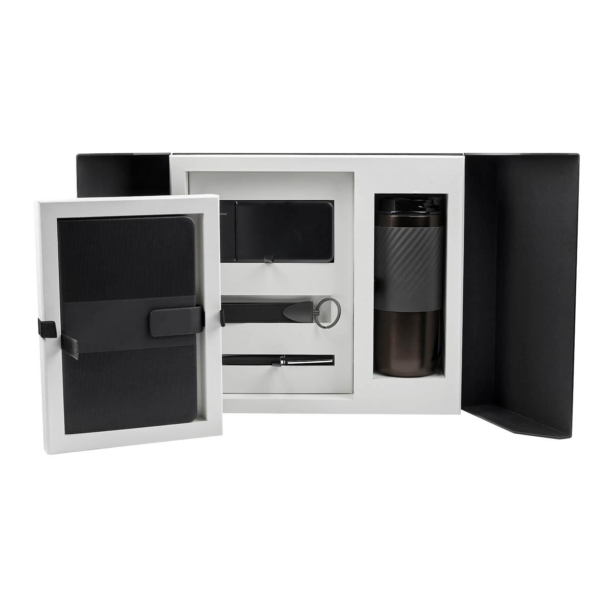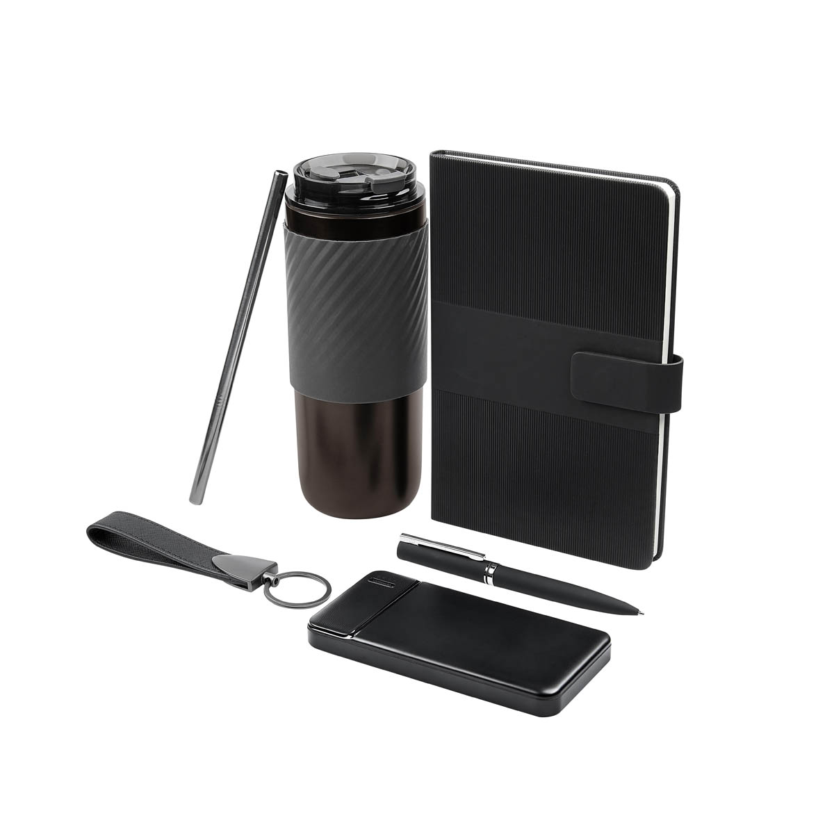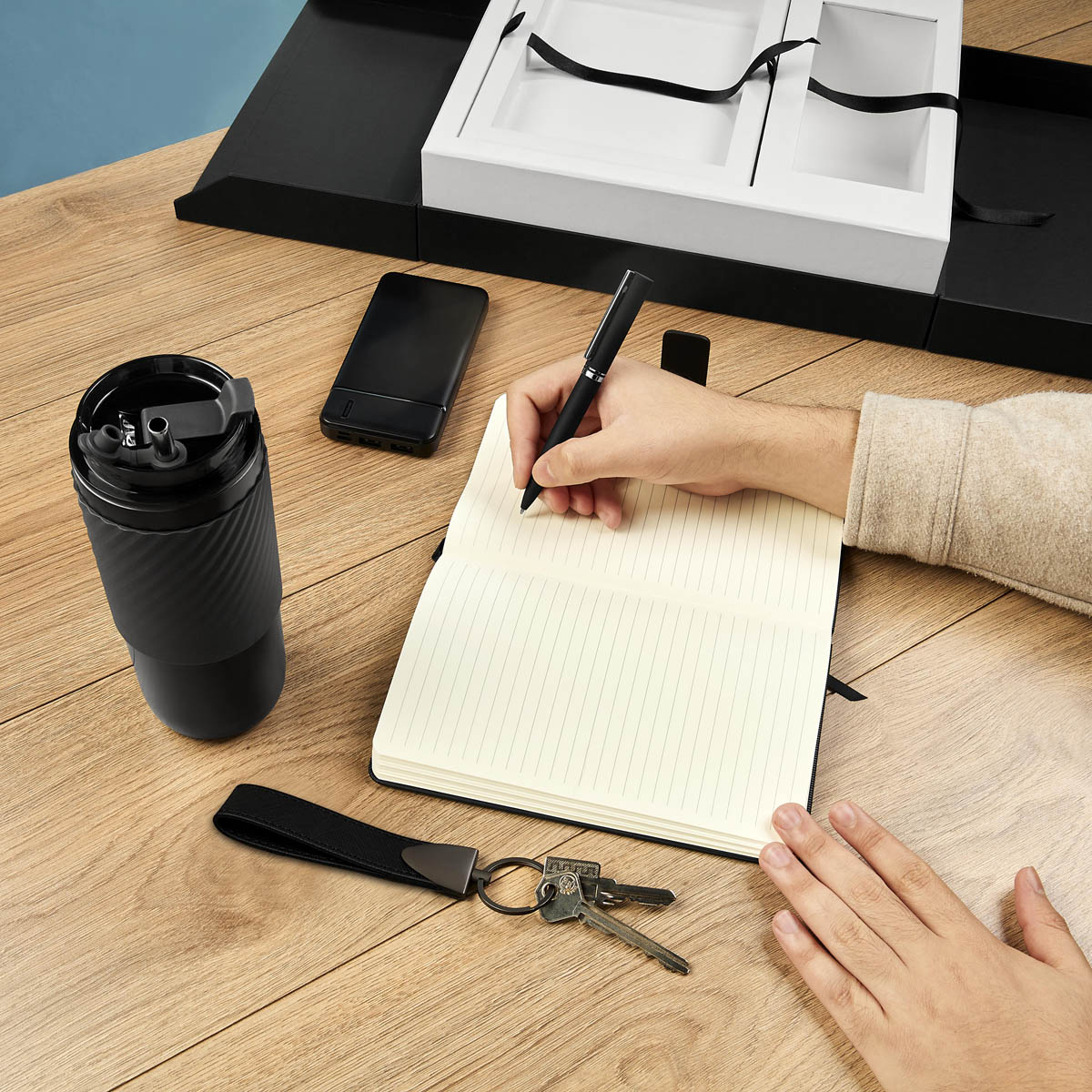 SET ESTAMBUL - Exclusivo set de regalo. Opción perfecta para un obsequio de alto valor y calidad. Este set viene en una elegante caja negra con solapa de abertura central, lo que no solo proporciona un acceso fácil al contenido, sino que también añade un toque sofisticado al diseño. El interior de la caja presenta un color neutro que realza el aspecto general, creando un hermoso contraste con el exterior negro. Incluye termo con doble pared metálica, cerrado al vacío, tapa con sistema de rosca, sobretapa de push y ranura especial con tapón para popote, también incluye popote metálico con boquilla de silicón. Libreta de 80 hojas de raya, cubierta rígida de curpiel, separador interno y broche magnético. Bolígrafo metálico con sistema twist y terminado rubber. Llavero metálico combinado con curpiel, aro con giro de 360°. Batería auxiliar para smartphone de 10,000 mAh, incluye 2 puertos USB, 1 micro USB y 4 LEDs indicadores de carga.