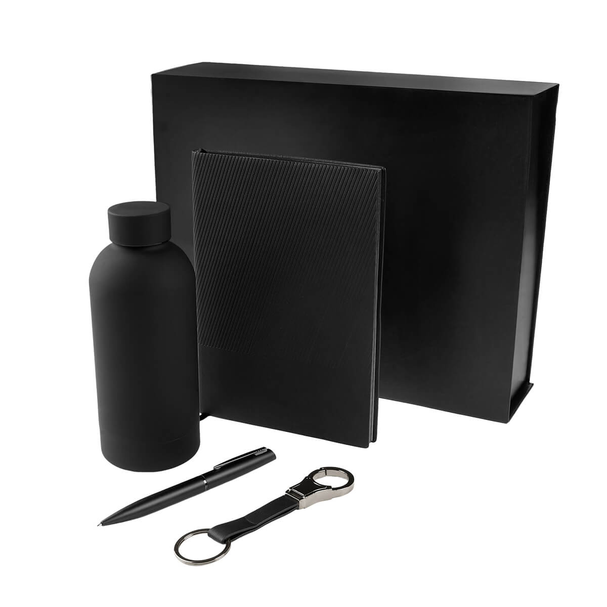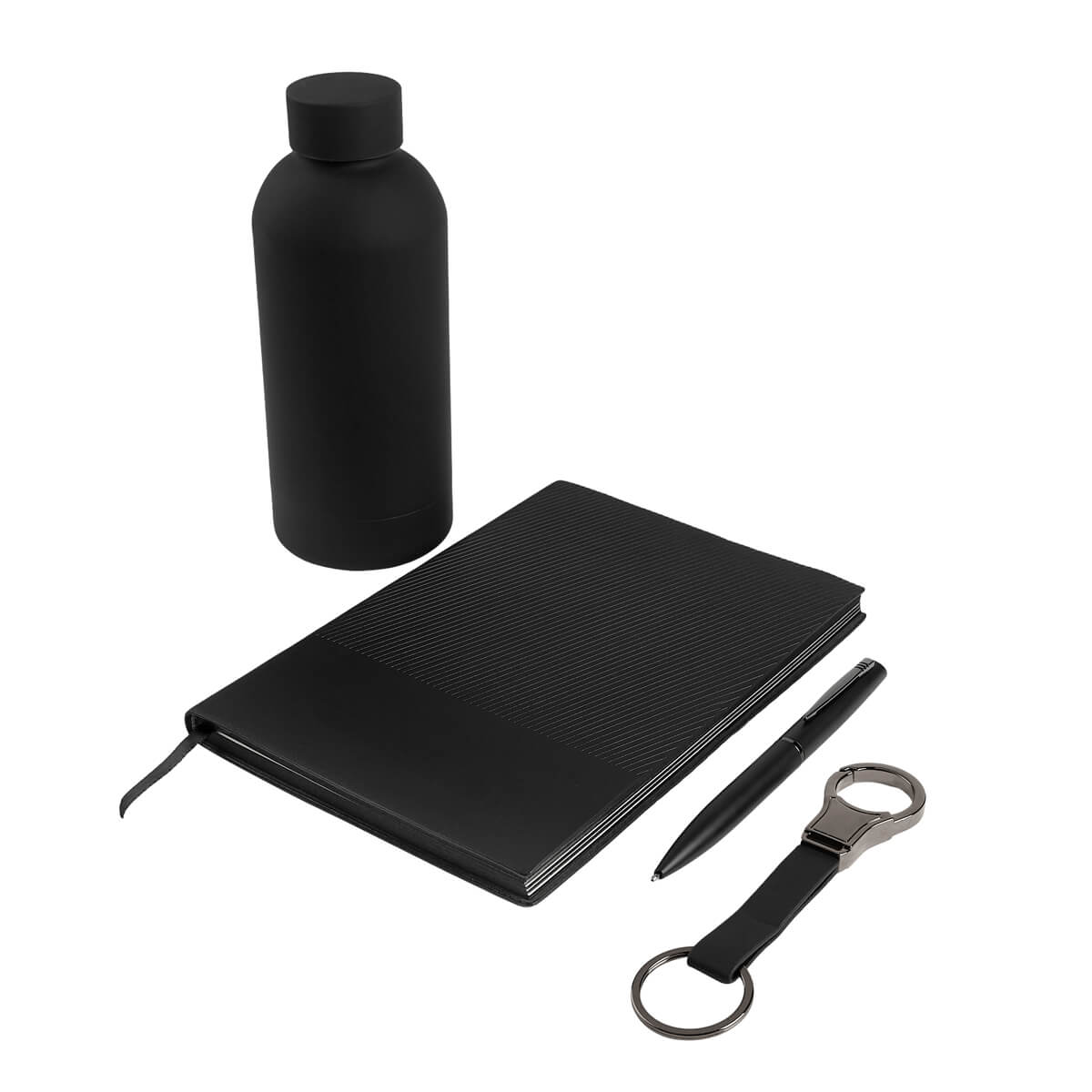 SET NOTTE - Set de regalo corporativo de 4 piezas. Incluye libreta de pasta blanda con 96 hojas a raya y listón separador, bolígrafo metálico con sistema twist, llavero de doble aro metálico con cinta de curpiel y termo de acero inoxidable de doble pared cerrado al vacío, terminado rubber que lo hace suave al tacto. Incluye caja rígida de regalo.