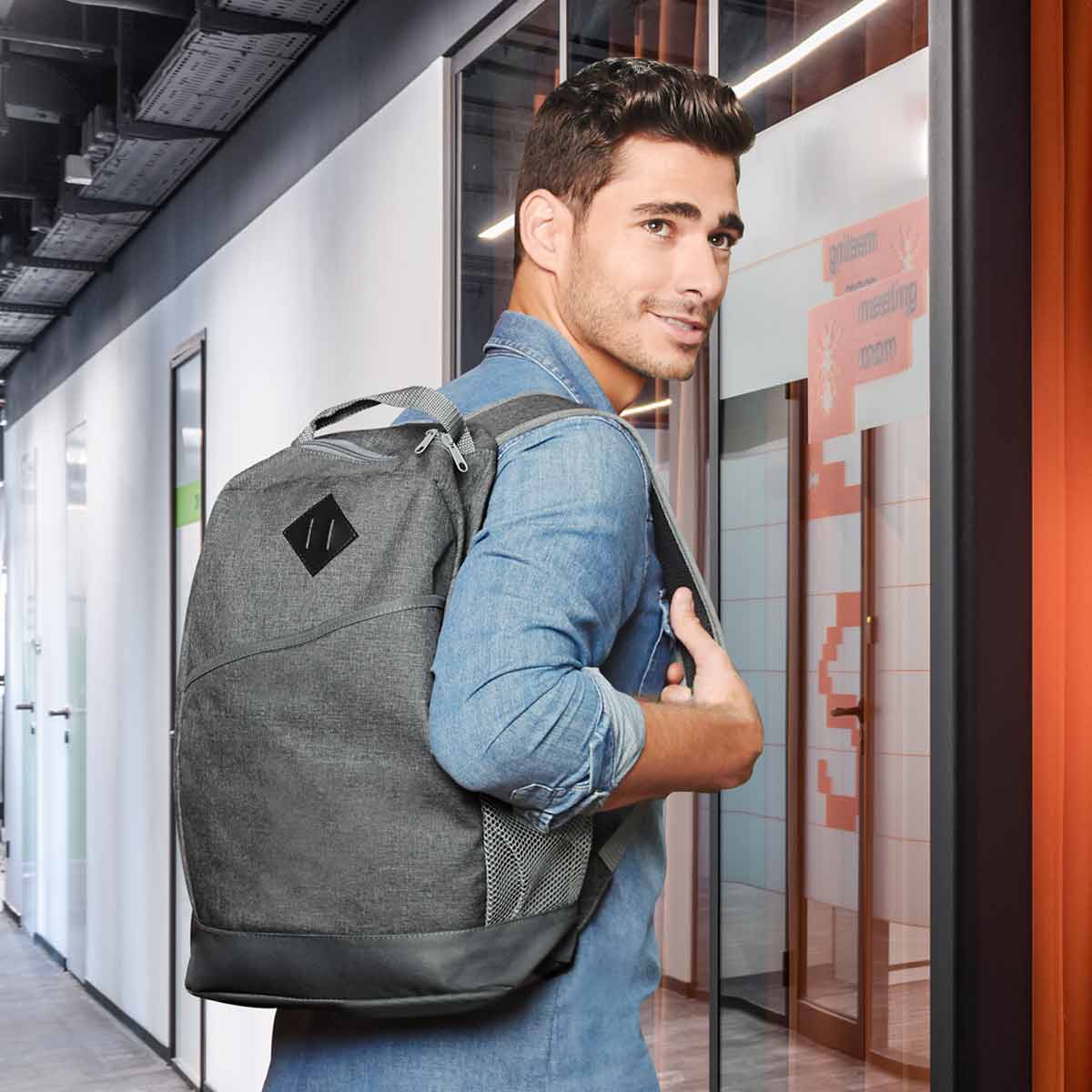 MOCHILA WALLY - Bolsa principal con cierre y bolsa lateral de red. Bolsillo frontal. Compartimento para laptop de 16”. Tirantes ajustables y asa de agarre superior.