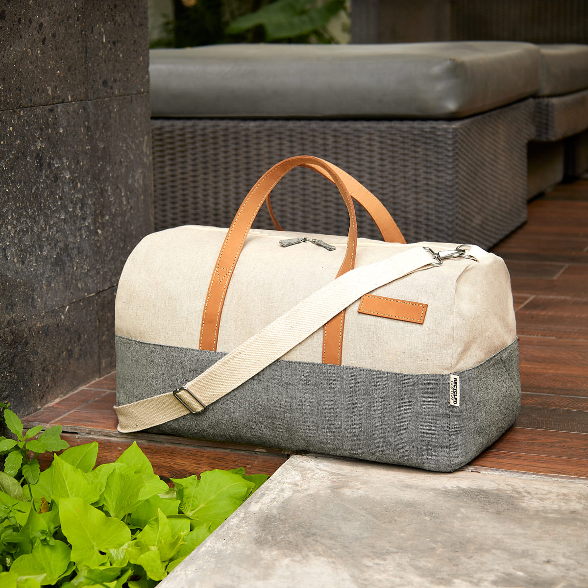 MALETA TAVY - Maleta que destaca tanto en diseño como en estilo. Es ligera y ecológica, hecha de algodón reciclado. Compartimento principal con cierre y base de cartón removible. Incluye asa ajustable removible para hombro.