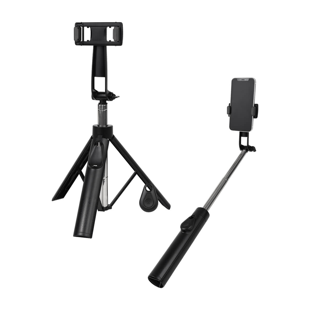 SELFIE STICK SURAT - Selfie stick con tripié amplio para mayor estabilidad. Incluye control remoto Bluetooth con alcance de hasta 10 m, ideal para capturar fotos o videos a distancia. Su brazo extensible de 86 cm y su holder ajustable garantizan ángulos perfectos para cada toma. Perfecto para selfies, videollamadas o grabaciones creativas. El control remoto funciona con batería de botón (incluída).