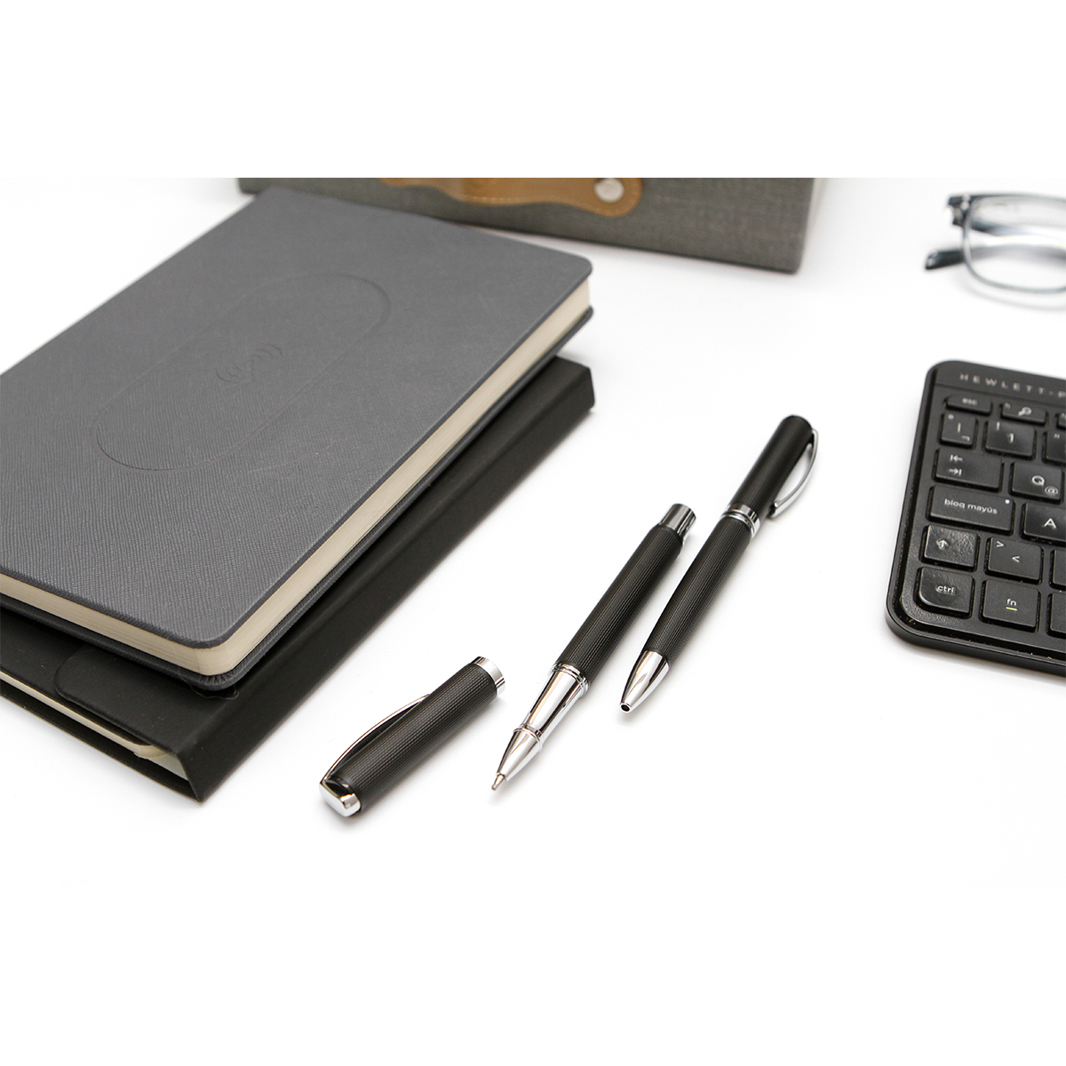 Set de boligrafos Bevera - Este Set de bolígrafos incluye una ball pen y un roller pen, ambos fabricados en metal, lo que les confiere durabilidad y un aspecto sofisticado, presentan detalles cromados en la punta y el clip, lo que agrega un toque de elegancia y distinción, utilizan tinta de escritura negra e incluyen un estuche especialmente diseñado para proteger y almacenar los bolígrafos de forma segura.