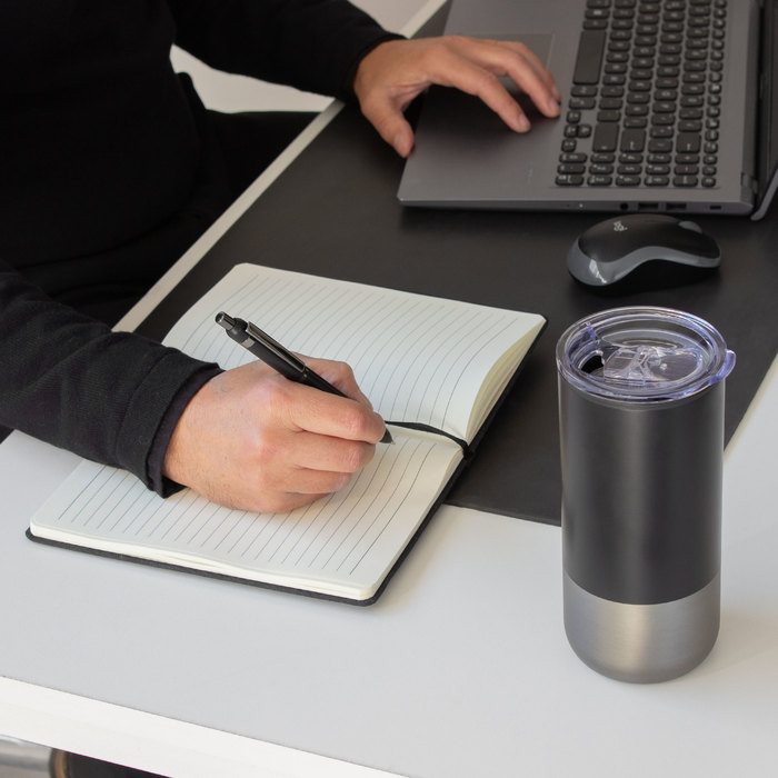 Set ejecutivo "MOON BOX" Caja de regalo compuesta por 3 artículos: - 1 bolígrafo retráctil, cuerpo de aluminio color negro mate. Clip, pulsador y anillos metálicos color gun. Destape electroplateado en ambas partes. Tinta negra. - 1 libreta color negro de 14 x 21 x 1,5 cm. Con placa metálica color gun de 5 x 2 cm. Tapa de cartón 300g recubierta en RPET 310. Interior de 80 hojas rayadas de 70g. Encuadernación cosida y cierre con banda elástica color negro. - 1 mug color negro combinado con gun en su base, de 8 x 17,6 cm. y 450 ml. Doble pared. Interior en polipropileno, exterior en acero inoxidable 201. Tapa plástica a presión con anillo de silicona.