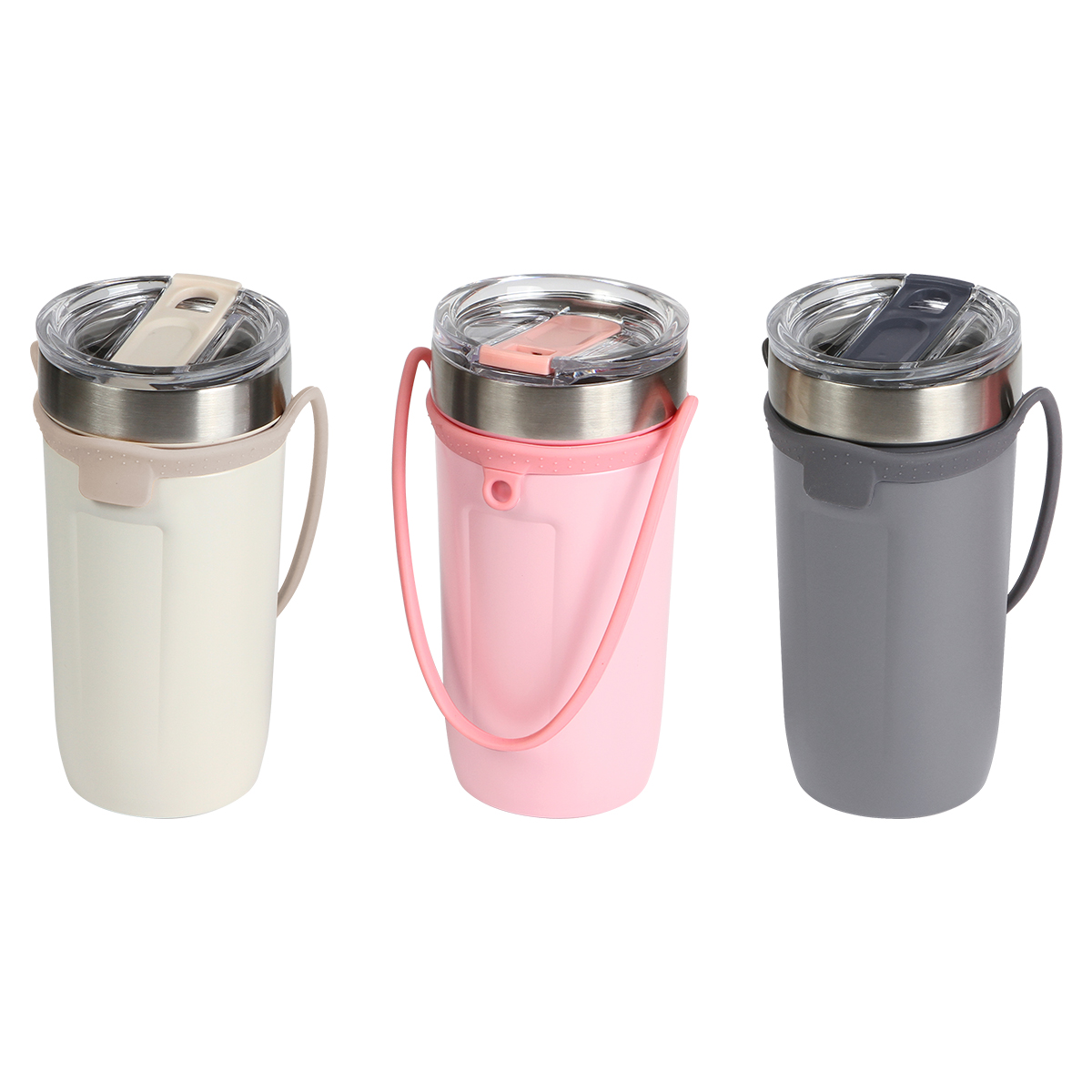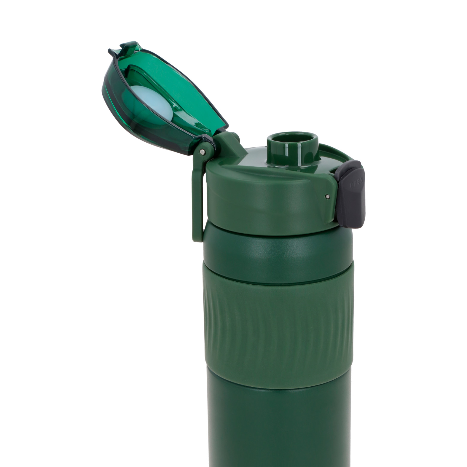LAN Termo de doble pared de acero inoxidable, insulado al vacío, acabado rugoso, con manga de silicón, tapa enroscable, asa y botón con candado de seguridad.
