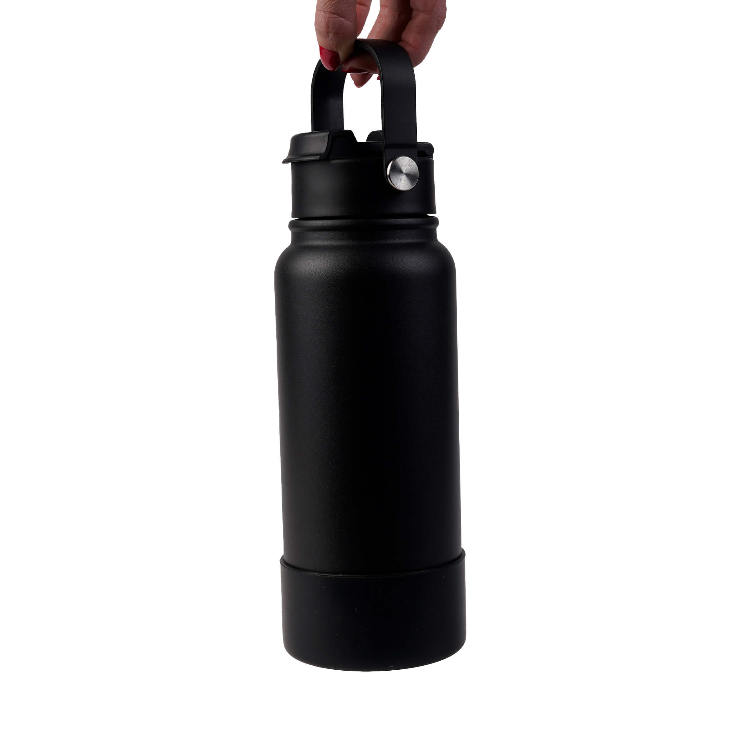 TOLIMA Termo con doble pared de acero inoxidable, insulado al vacío y base de silicón. Cuenta con tapa enroscable, boquilla abatible, popote y asa.