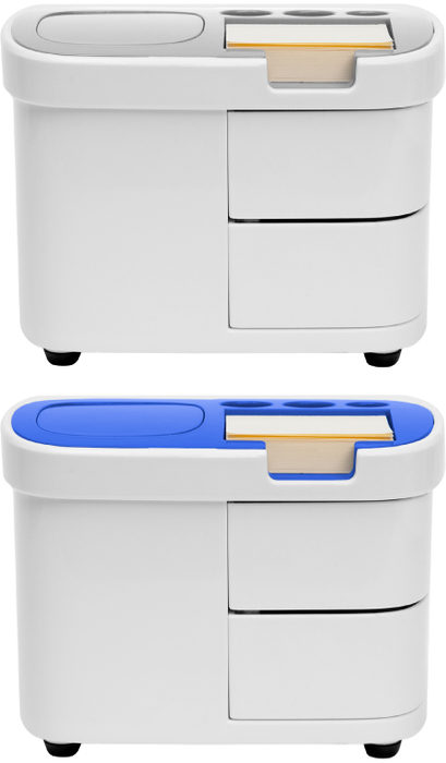ORGANIDESK Organizador para escritorio. Cuenta en la parte superior con espacio para tres bolígrafos, notas autoadhesivas y un botón pulsador que sirve para guardar clips. Clips de colores incluidos. En la parte inferior dos cajones.