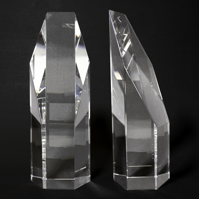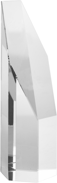 TROFEO DE CRISTAL DIAGONAL Bloque de cristal en forma de prisma 3D. Corte diagonal en la parte superior. Permite grabado de logo o texto. Presentación en estuche con cierre magnético.