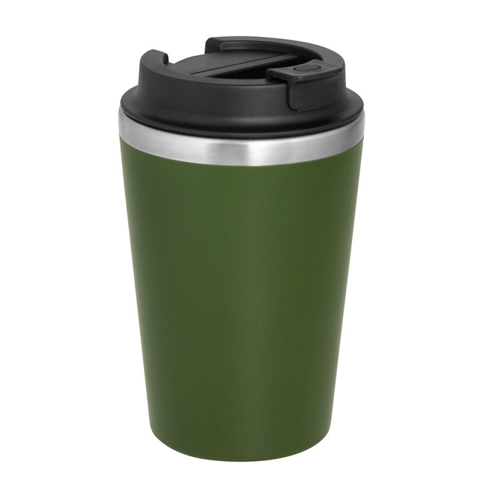 MUG "CAMPER" Mug doble pared. Interior de acero inoxidable 304 y exterior de PP con acabado mate. Tapa de PP con anillo de silicona y seguro antiderrame. Base antideslizante. Presentación en caja de regalo Kraft. Ficha técnica