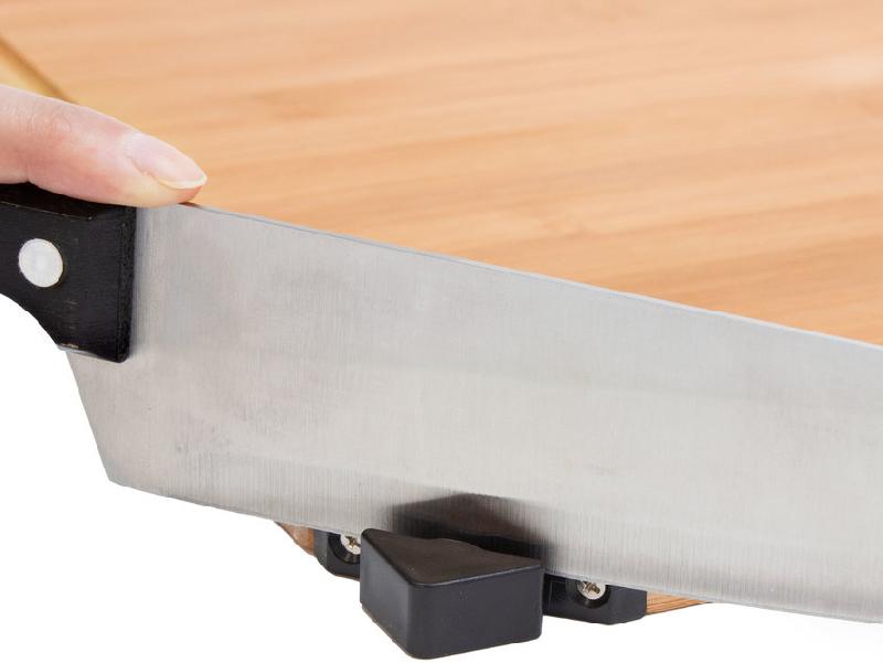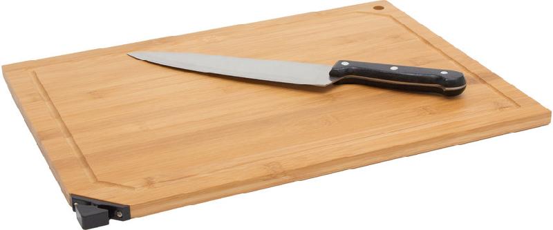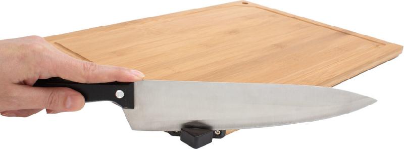 SET DE CORTE "BAMBCUT" Tabla de Bambú con afilador incorporado y cuchillo. Cuchillo de acero inoxidable con mango en madera color negro de 32.5 cm . Afilador de plástico y acero de 5 x 2,4 x 1,2 cm. Presentación en caja de regalo.
