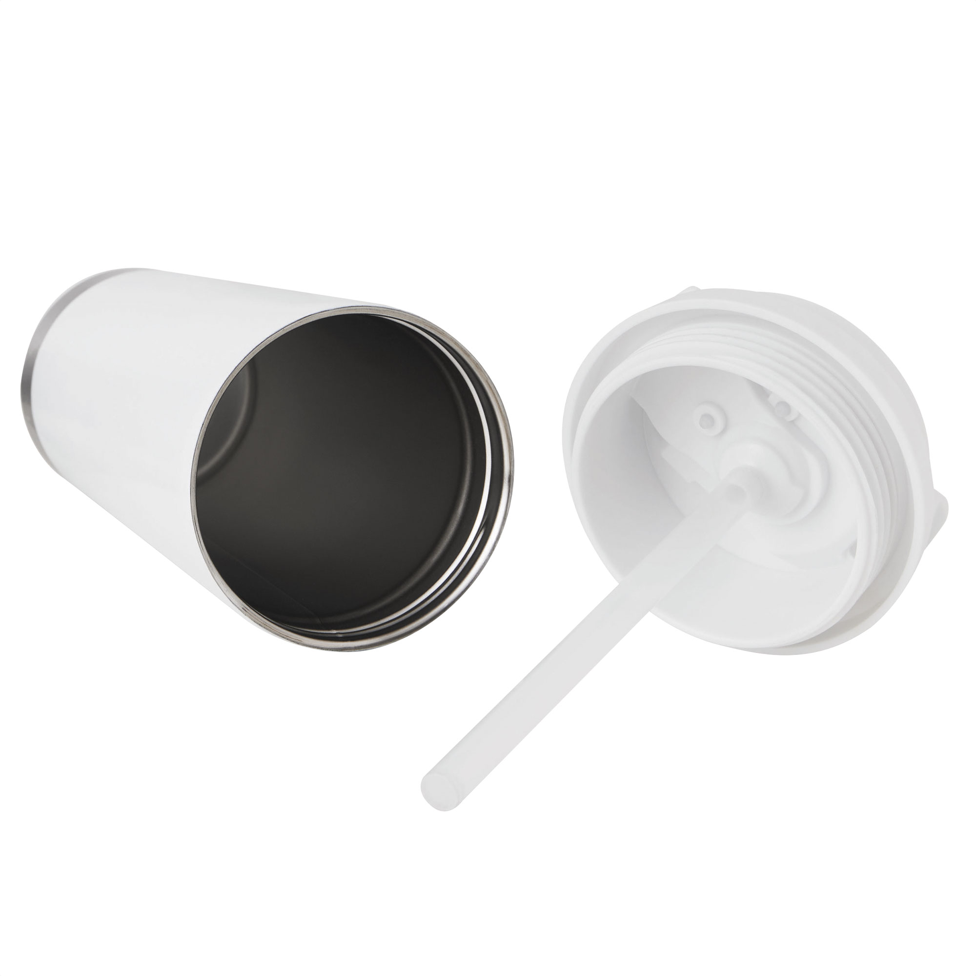 Mug térmico "LUNGO" Mug doble pared, sellado al vacío. Interior en acero 304 y exterior en acero 201. Tapa de polipropileno a rosca y anillo de silicona, 2 en 1, con popote de polietileno incorporado, seguro antiderrame a presión y correa de poliéster. Tapa y correa del mismo color que el vaso. Pintura con acabado mate, textura suave al tacto. Base en acero 201. Mantiene hasta 12 hs la temperatura de las bebidas calientes y 24 hs de las bebidas frías