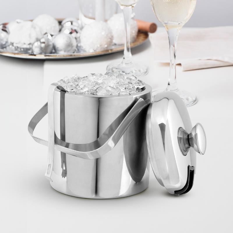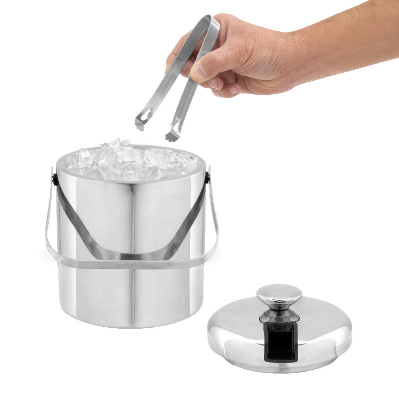 Hielera " ALASKA" Capacidad 1100 ml. Acero inoxidable. Interior en acero 304 y exterior en acero 201. Hielera de mesa con tapa. Pinza para hielo de acero inoxidable, encastrable en la misma tapa. Asa de acero inoxidable para transportar. Presentación en caja de regalo kraft.