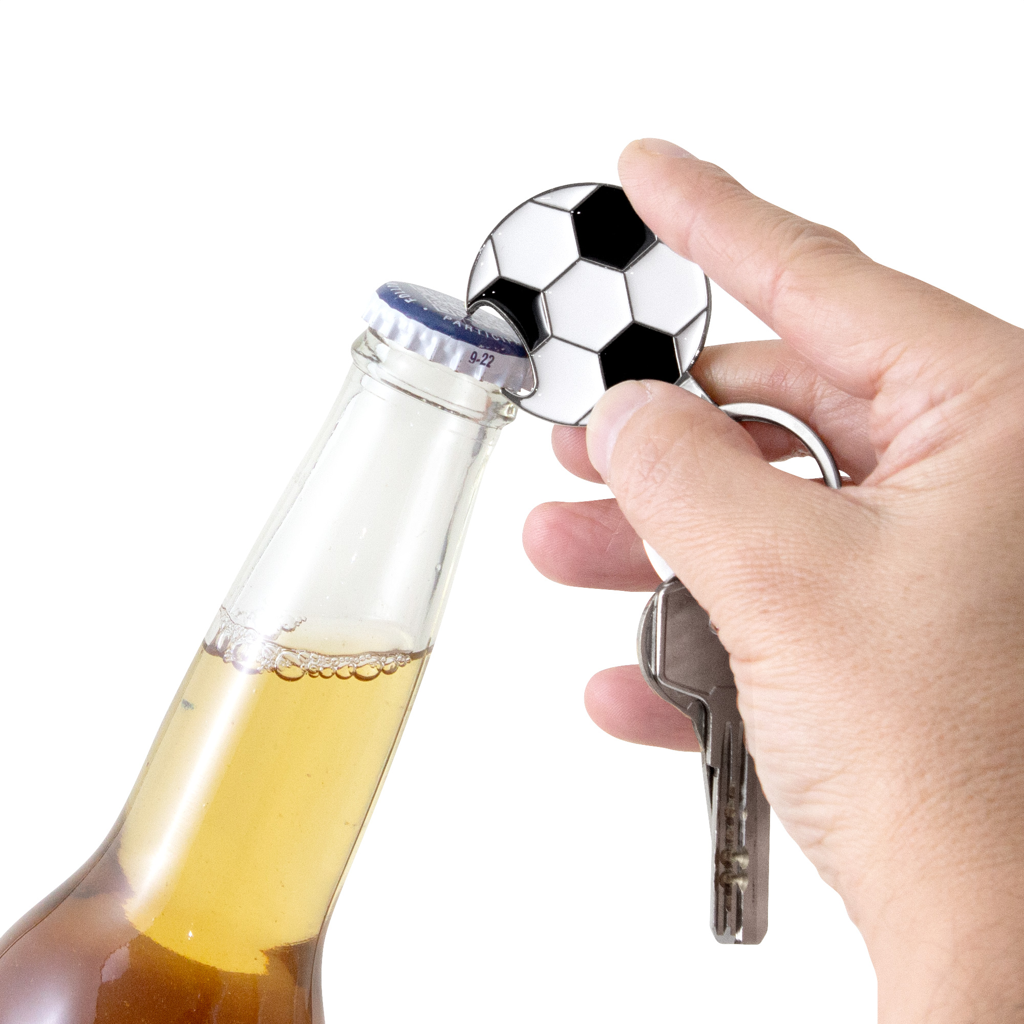 Llavero destapador "PORTER" Llavero con destapador abre botellas. Estructura metálica con forma de pelota de fútbol pintada con esmalte brillante de colores negro y blanco