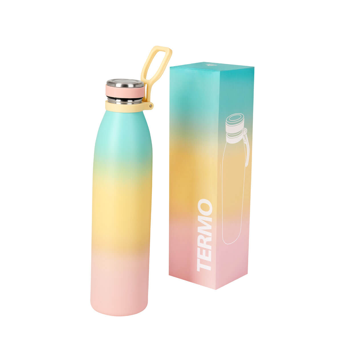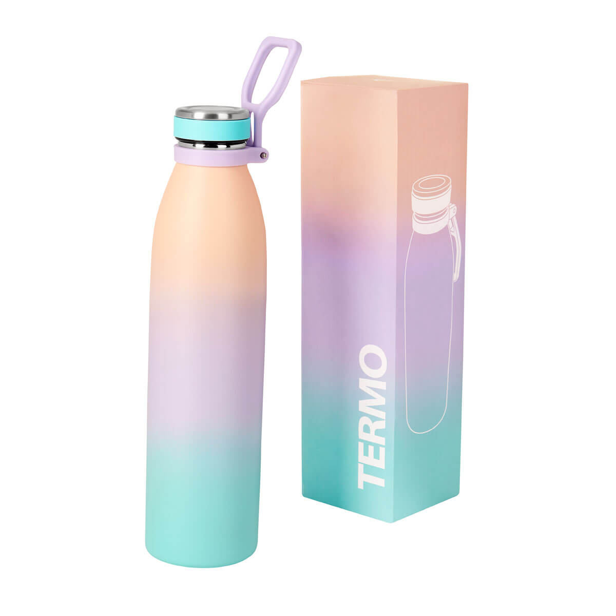TERMO MANDALA - Doble pared. Cerrado al vacío. Pared interna y externa acero inoxidable. Terminado rugoso. Tapa de rosca con banda de silicón. Cuenta con asa de plástico plegable. Mantiene temperatura caliente 8 hrs y temperatura fría 12 hrs aproximadamente. Incluye caja individual.