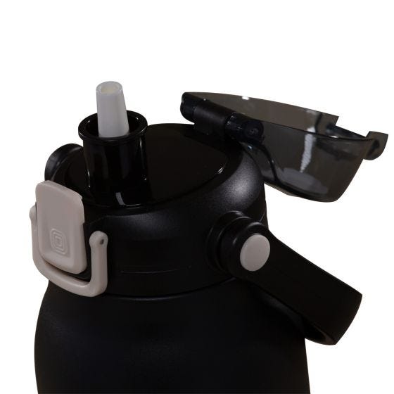 TERMO ZINAT - Doble pared. Cerrado al vacío. Pared interna y externa de acero inoxidable. Terminado rugoso. Tapa de plástico con sistema de rosca. Sobretapa con cierre push y seguro antiderrame. Asa plegable incluida. Mantiene temperatura caliente hasta 6 hrs y temperatura fría hasta 12 hrs. Caja individual incluida.