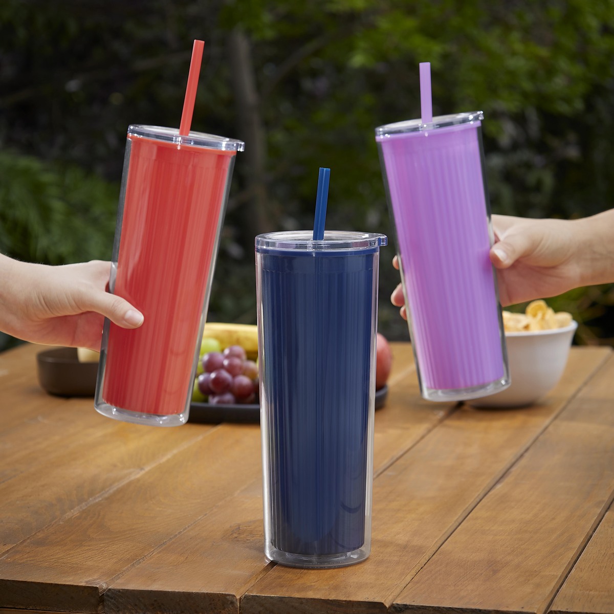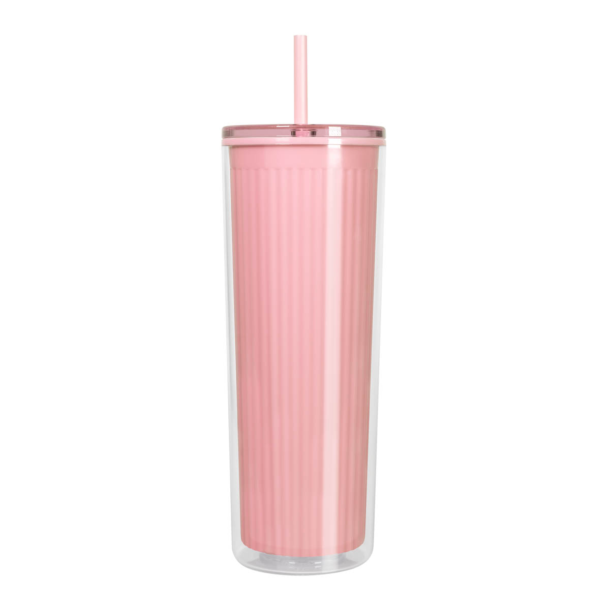 VASO NELI - Termo de plástico doble pared. Pared interna de color, texturizada a rayas, y pared externa lisa y transparente que, en conjunto, ofrecen un diseño moderno y vibrante. Incluye tapa de plástico con sistema push y popote a juego. Capacidad de 22 Oz. Base de 7.5 cm de diámetro. Incluye caja individual.