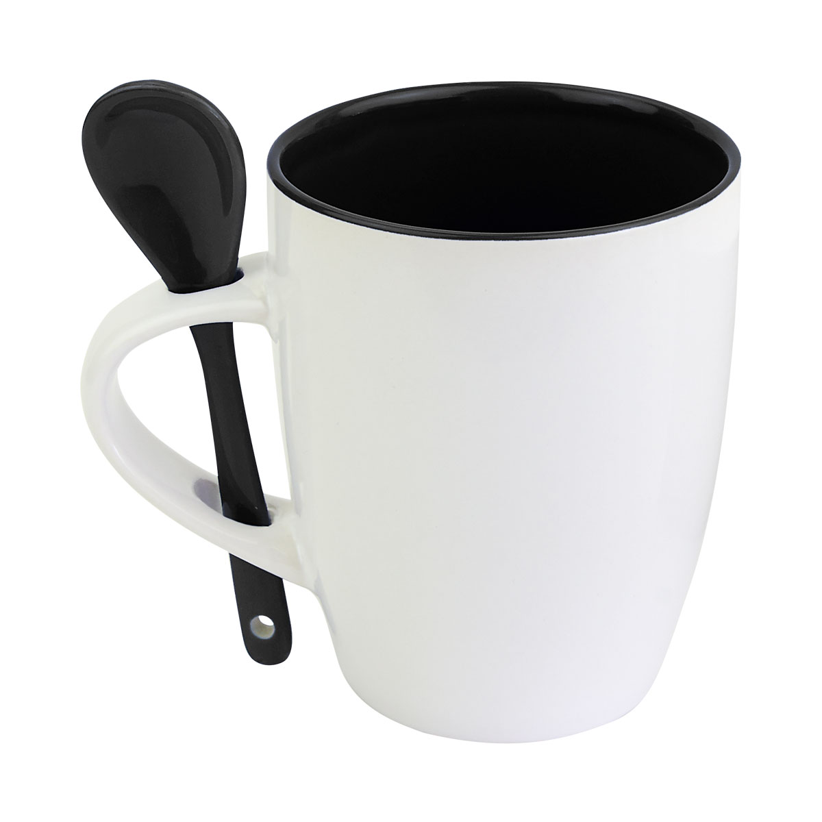 TAZA MOFFY - Taza de cerámica exterior blanco e interior de color. Incluye cuchara. Venta caja cerrada de 36 piezas.