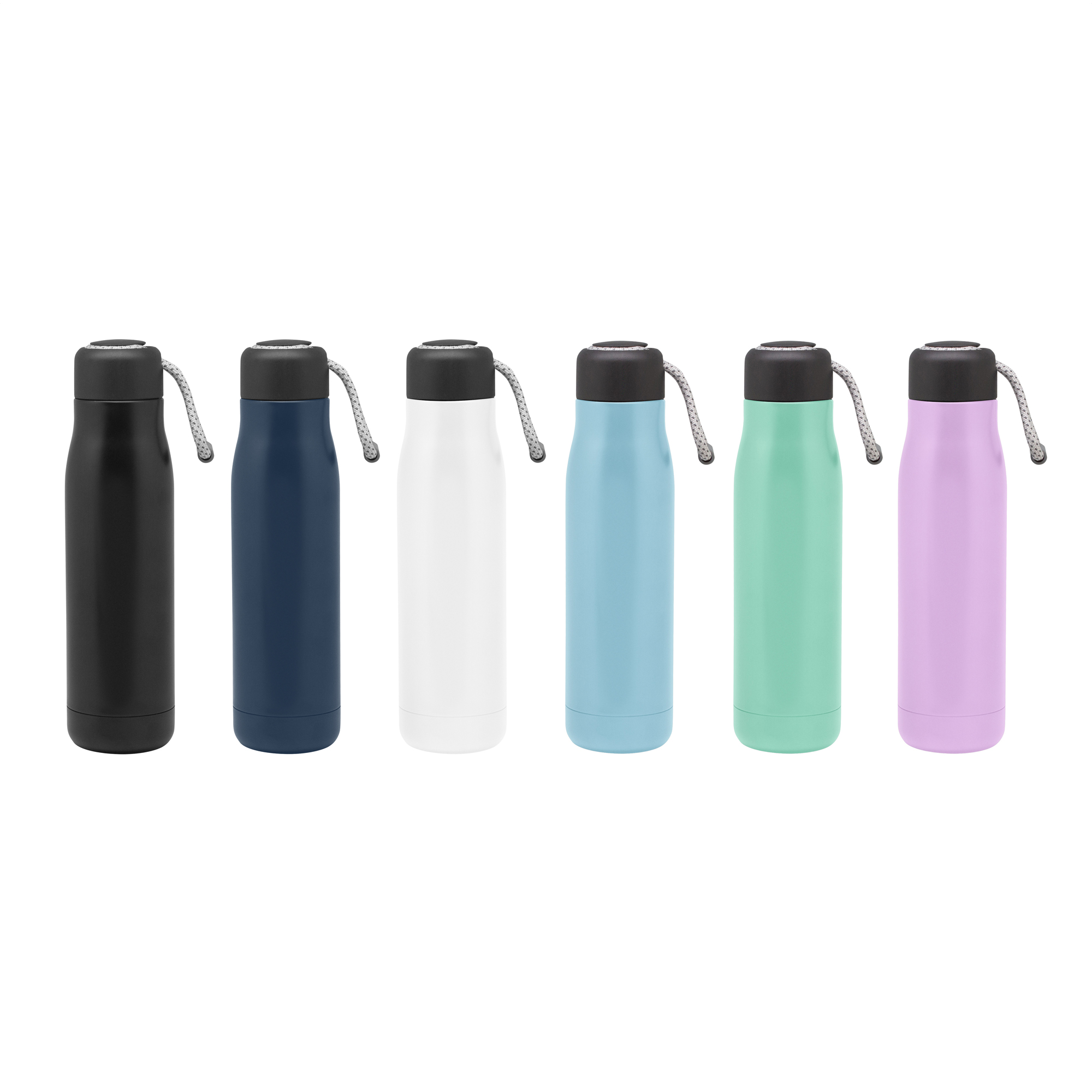 Termo metálico. - Termo fabricado en acero inoxidable y tapa de rosca anti derrames con arnés, fabricado en materiales de grado alimenticio, mantiene bebidas frías o calientes por un largo tiempo, no usar en microondas. Capacidad de 750 ml (25 oz). Incluye caja de cartón individual.
