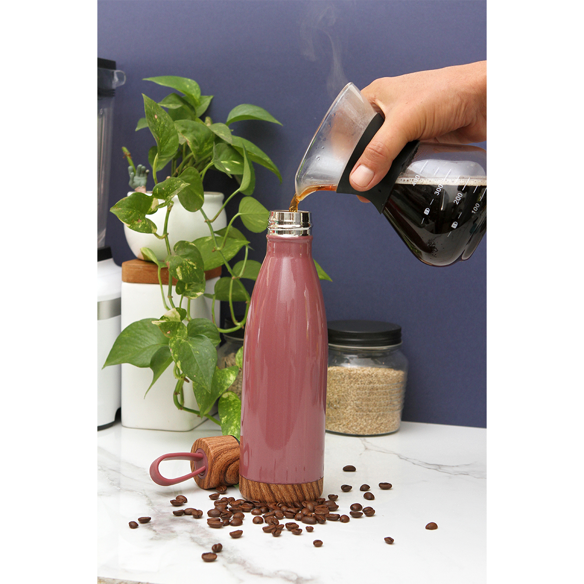 Termo Coruña. - Termo de acero inoxidable doble pared, con correa de TPR, tapa de rosca con detalles apariencia madera, fabricado en materiales de grado alimenticio, mantiene bebidas frías o calientes por un largo tiempo, no usar en microondas. Capacidad de 500 ml (17 oz). Incluye caja de cartón individual.