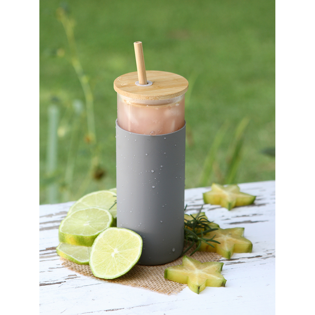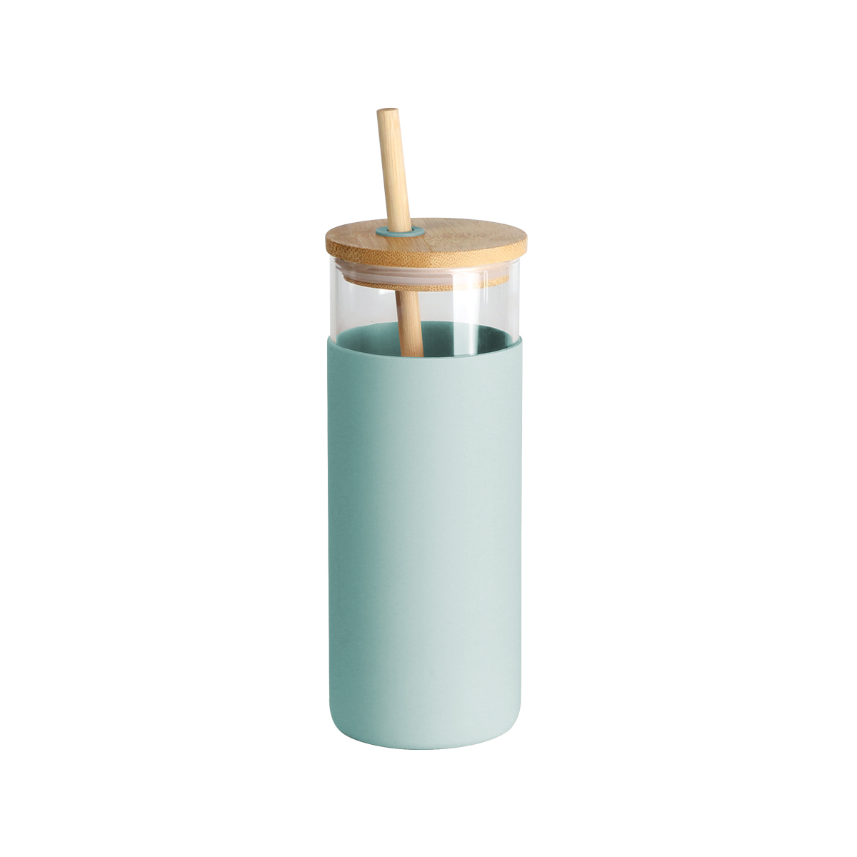 Cilindro Sorong. - Cilindro de vidrio de borosilicato con manga de silicón, tapa de bambú con anillo de silicón y popote de bambú. Capacidad de 450 ml (15 oz). Incluye caja de cartón individual.
