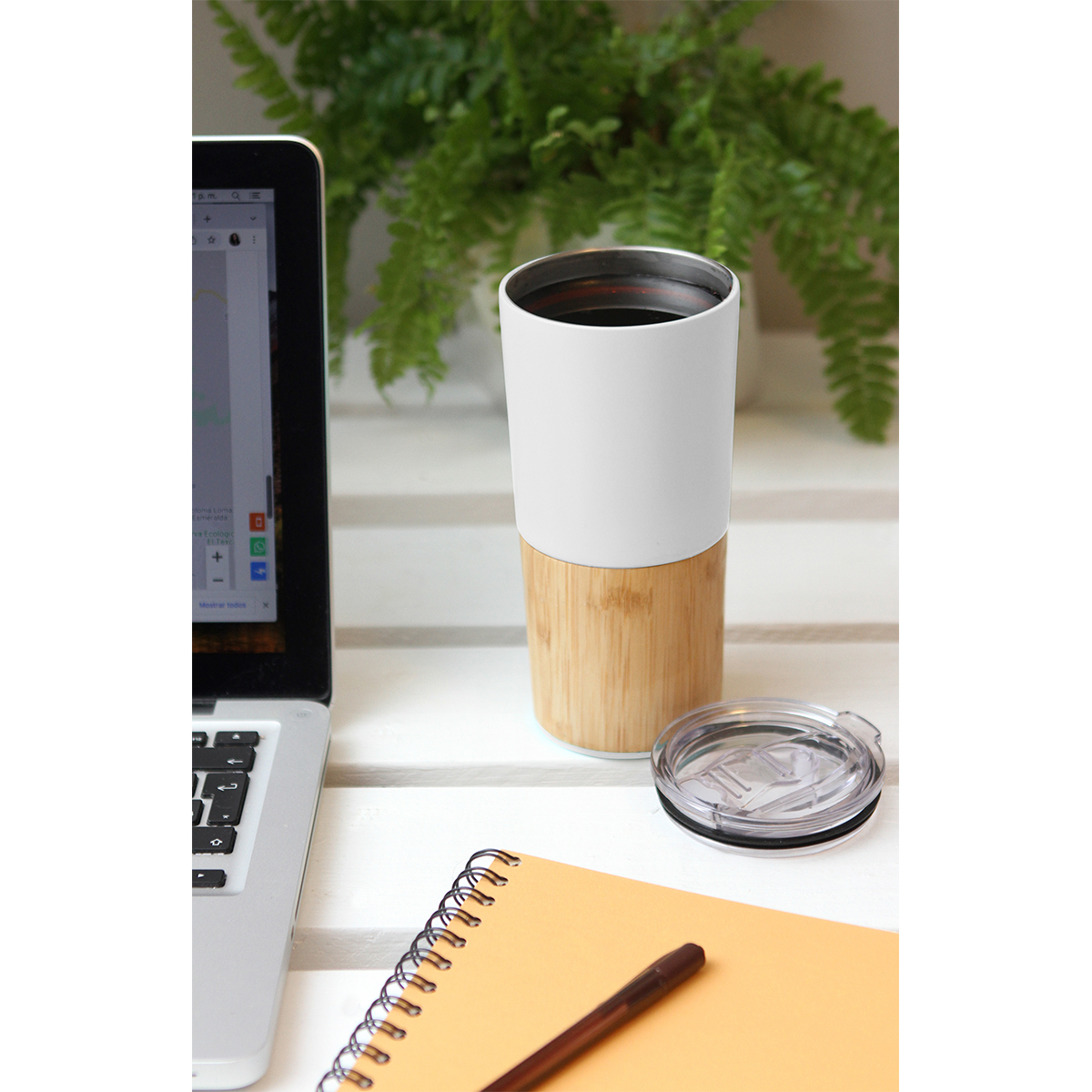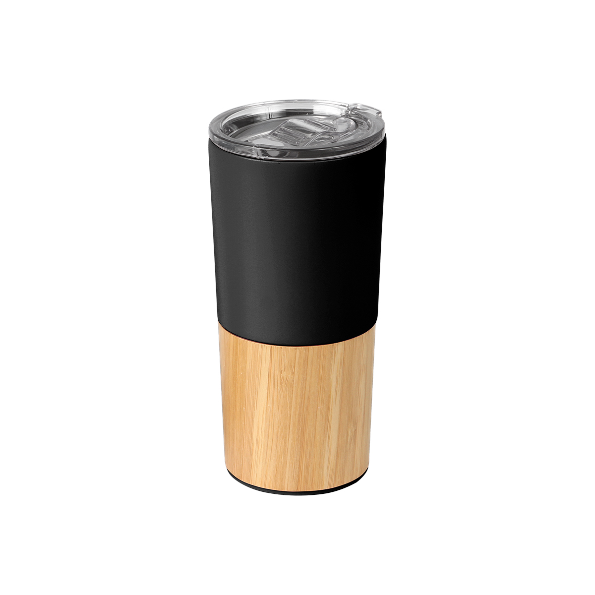 Termo Tafuna. - Termo de acero inoxidable doble pared con detalle en bambú, tapa plástica deslizable, fabricado en materiales de grado alimenticio, mantiene bebidas frías o calientes por un largo tiempo. No usar en microondas. Capacidad de 600 ml. Incluye caja de cartón individual.