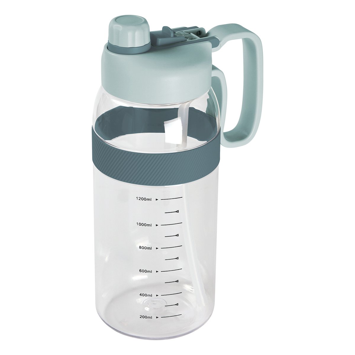 Botella Odesa. - Botella deportiva fabricada en PETG (poliéster de glicol) con asa de plástico, popote integrado, tapa de rosca con boquilla, detalle de silicón y escala de medición . Fabricada en materiales de grado alimenticio, no usar en microondas. Capacidad de 2,000 ml (67.5 oz).