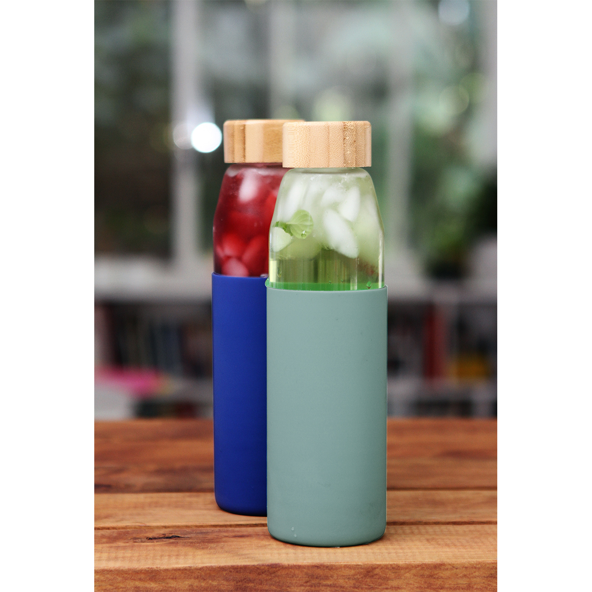 Botella Marineo. - Botella de vidrio de borosilicato con manga de silicón y tapa tipo rosca fabricada en bambú. Capacidad de 550 ml. Esta botella para agua está fabricada en materiales de grado alimenticio, su manga de silicón brida seguridad al agarre y versatilidad en su diseño. Incluye caja de cartón individual.